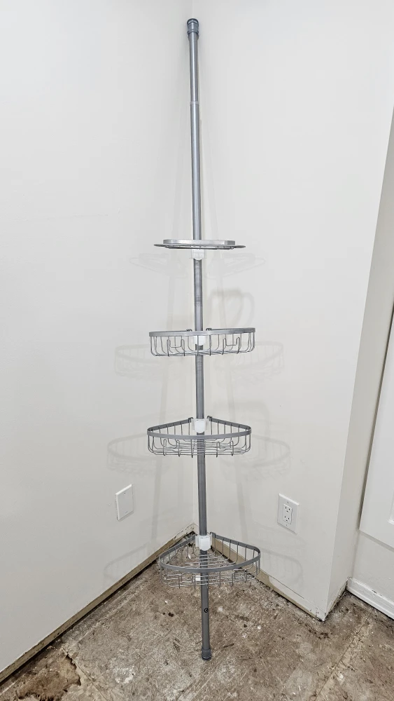 Here's a tension corner shower caddy! It's perfect for organizing your shower essentials in a small space. It has multiple shelves to hold shampoo, conditioner, soap, and more. It's in great condition and ready to use in your bathroom