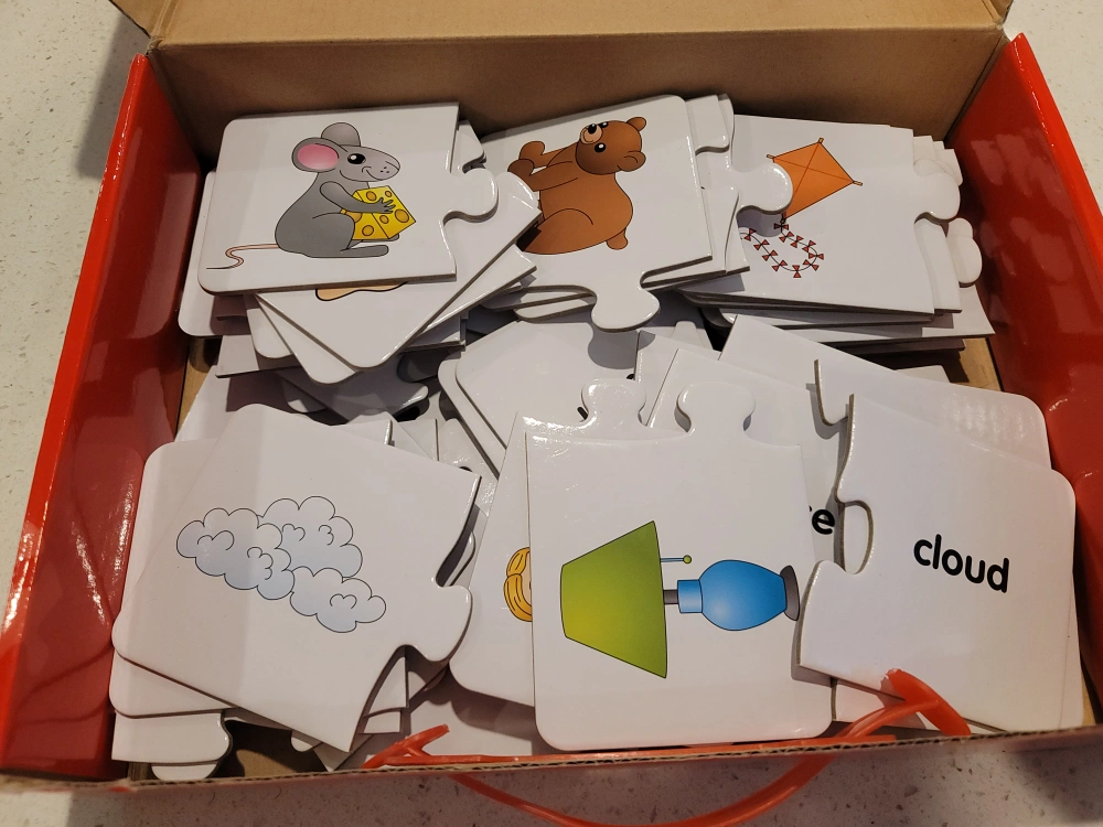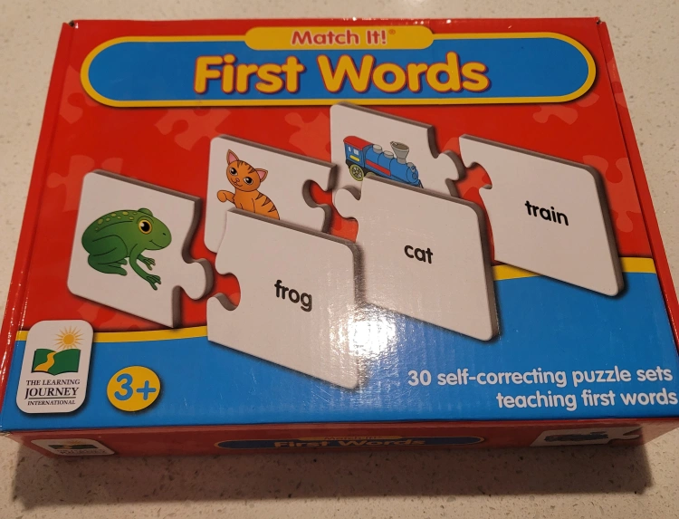 3+ Educational puzzle set for young children. Features 30 self-correcting puzzles. Teaches first words. Includes images and words. Fun and engaging for learning.