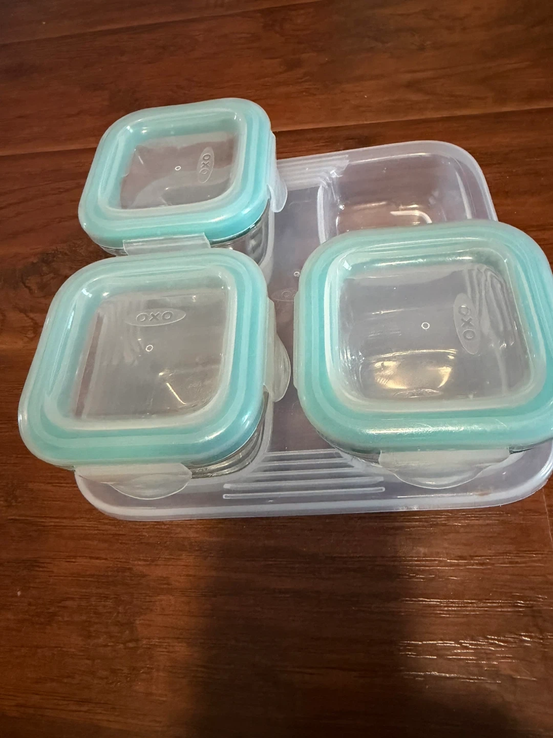 Set of 3 OXO 120ml glass containers with teal lids. These airtight, stackable food storage containers are perfect for keeping dry foods fresh. They have clear bases so you can easily see what's inside. Dishwasher safe.