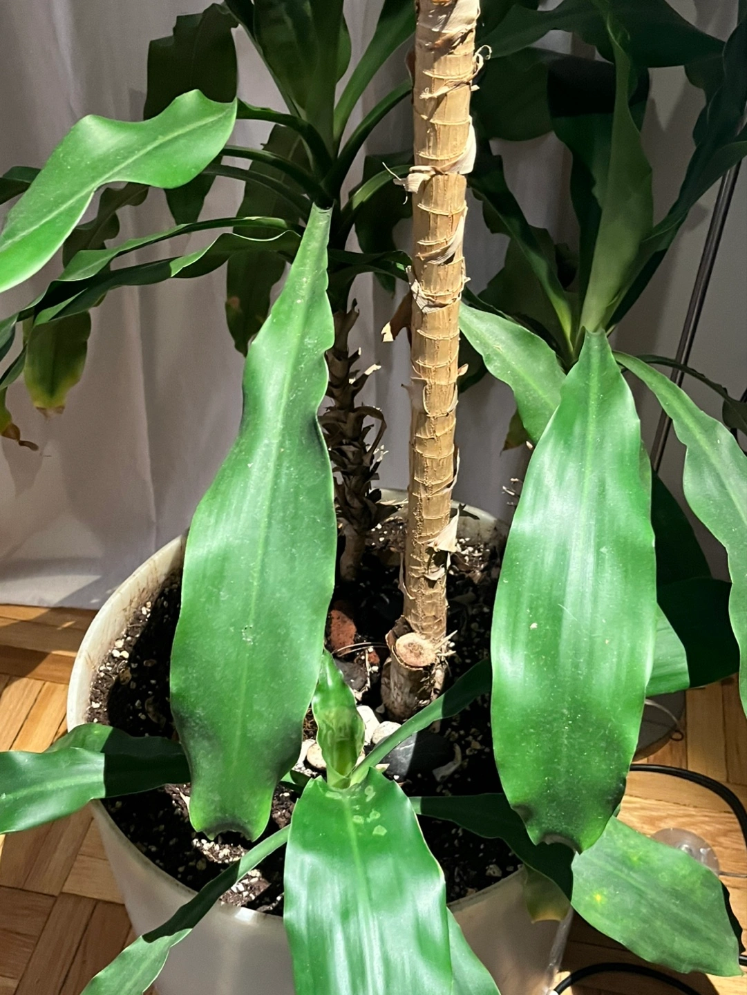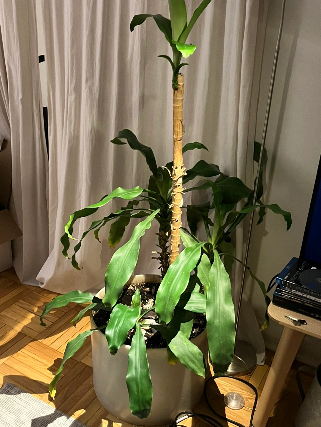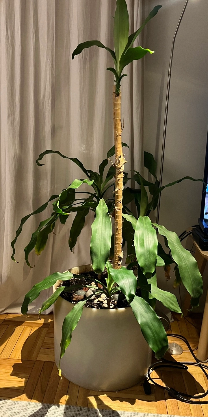 Tall Dracaena Marginata in a light of winter pot . Several stems and many leaves.