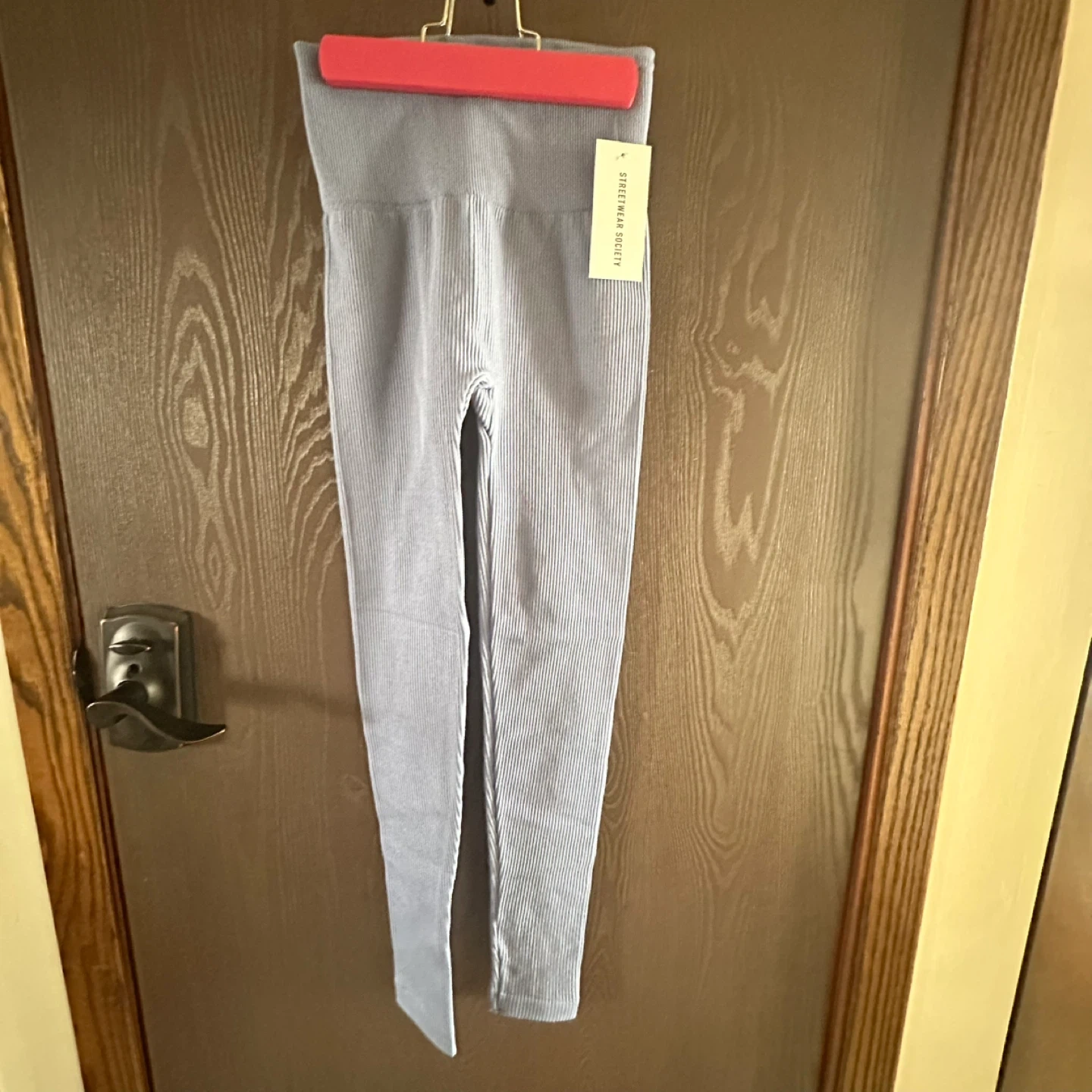 Streetwear Society leggings in a ribbed knit fabric. Size S/M. Light blue color. These are great for casual wear or workouts!