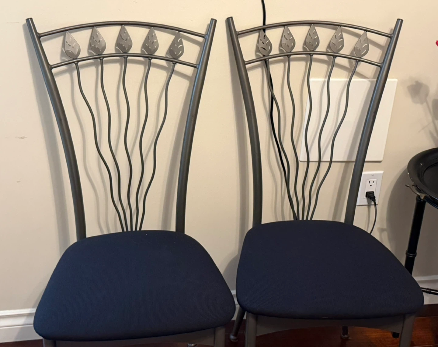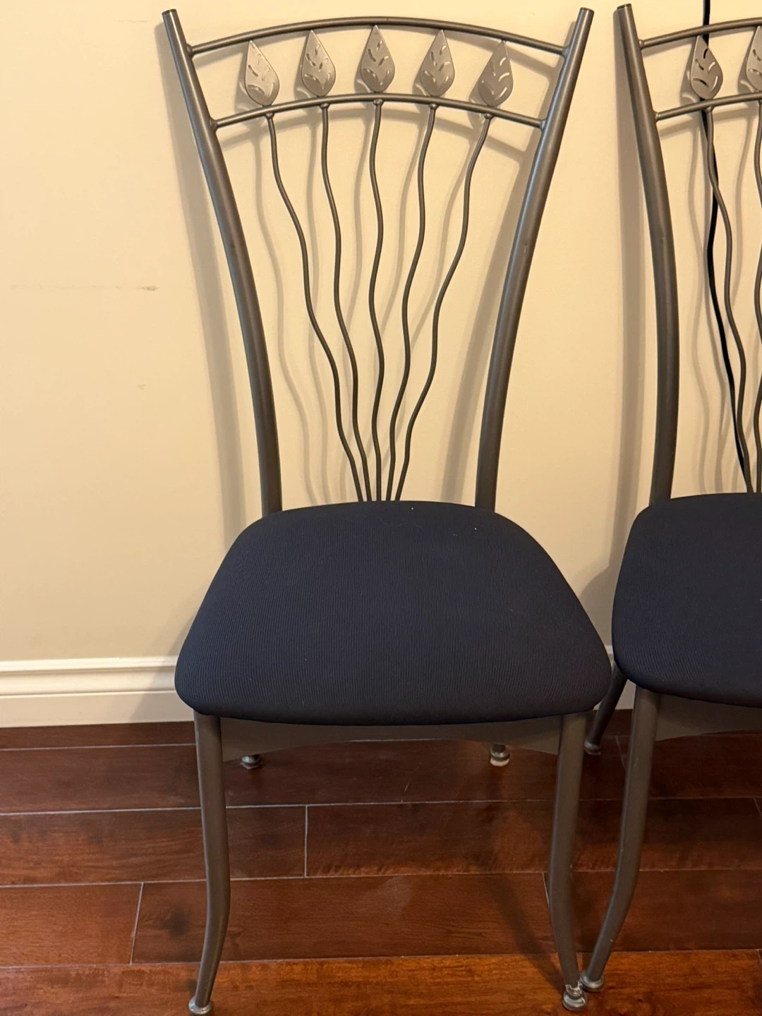 Two dining chairs featuring dark blue fabric upholstery and decorative metal backs with a leaf motif. The metal frames have a brushed gunmetal finish. They're sturdy and comfortable for your kitchen or dining area.