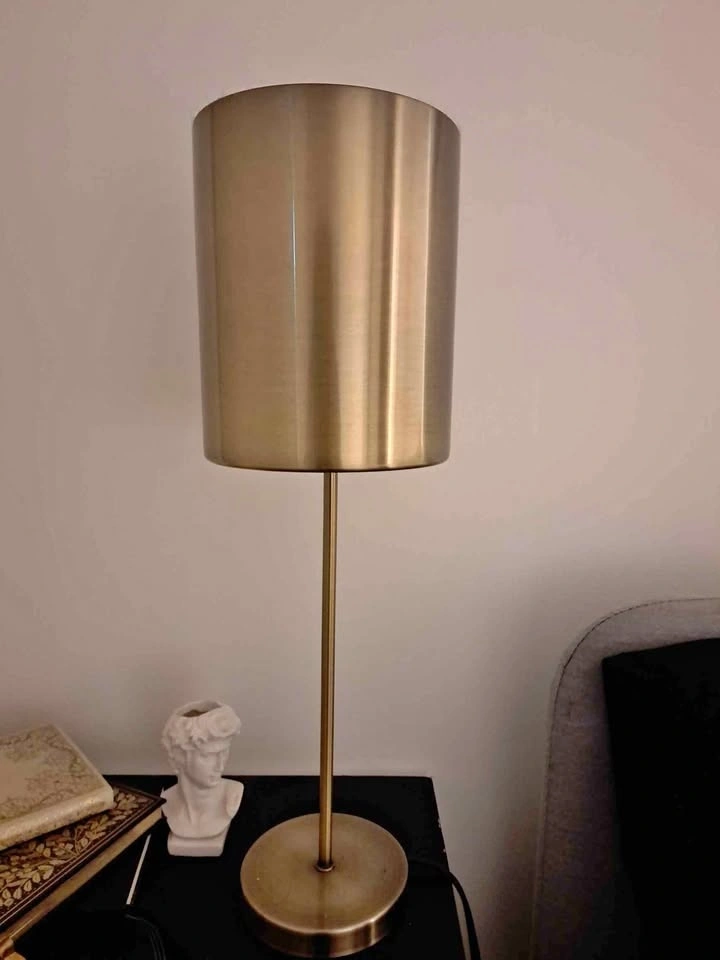 Modern brass table lamp with a sleek cylindrical shade and minimalist design.