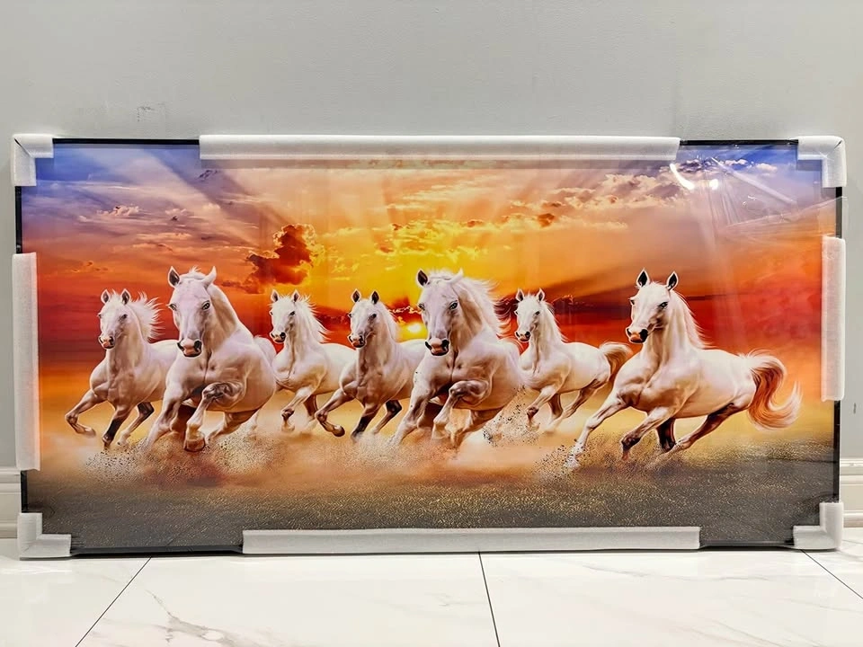 Stunning framed art piece with seven white horses running across a beautiful sunset. Still in original packaging with corner protectors and plastic wrap. Ready to hang.