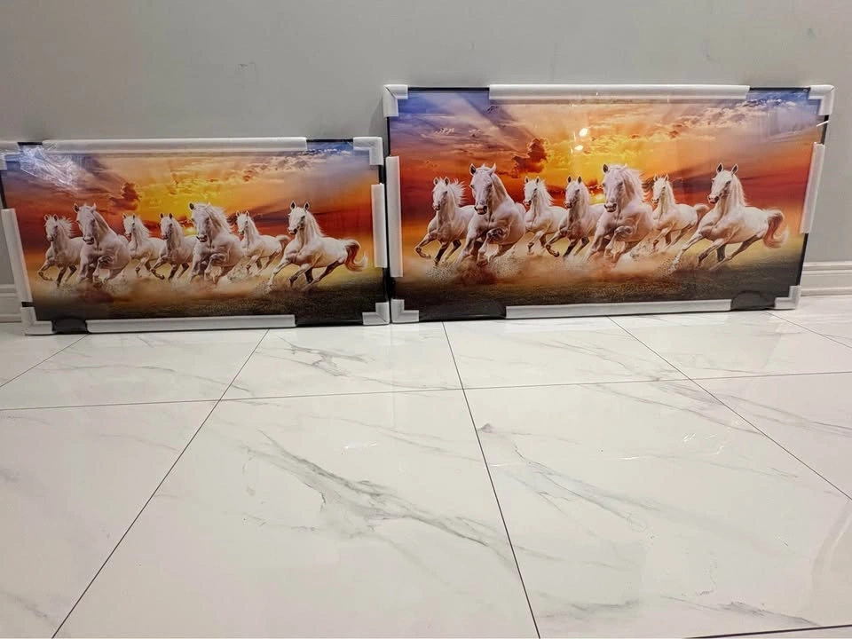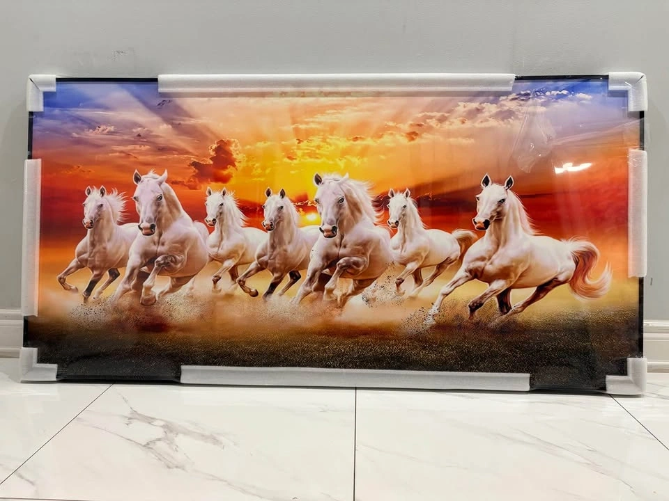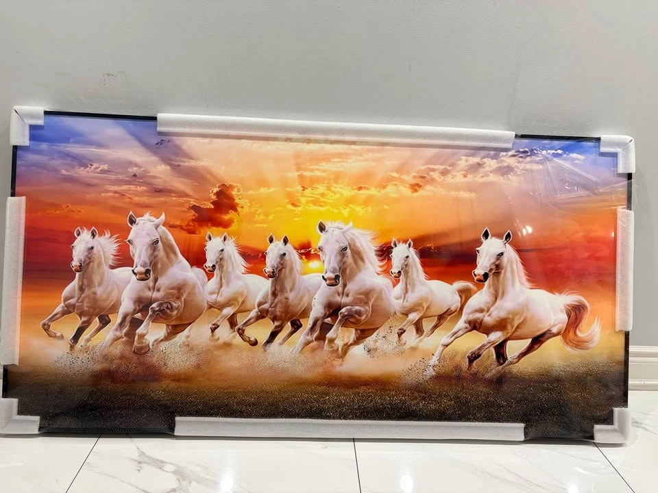 Stunning framed art piece with seven white horses running across a beautiful sunset. Still in original packaging with corner protectors and plastic wrap. Ready to hang.