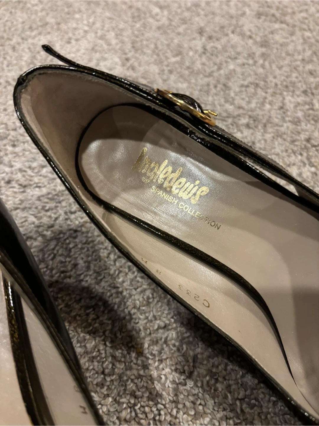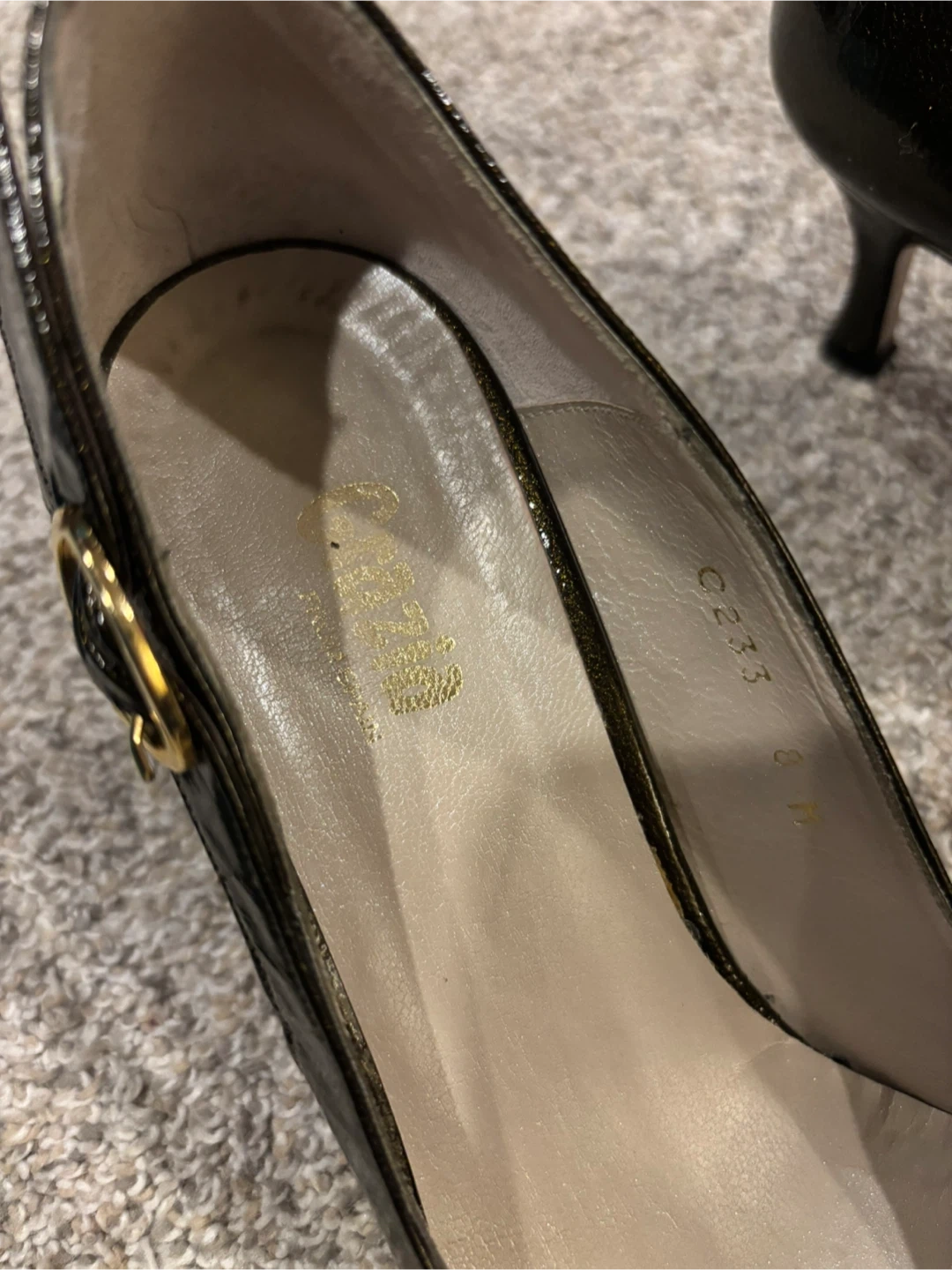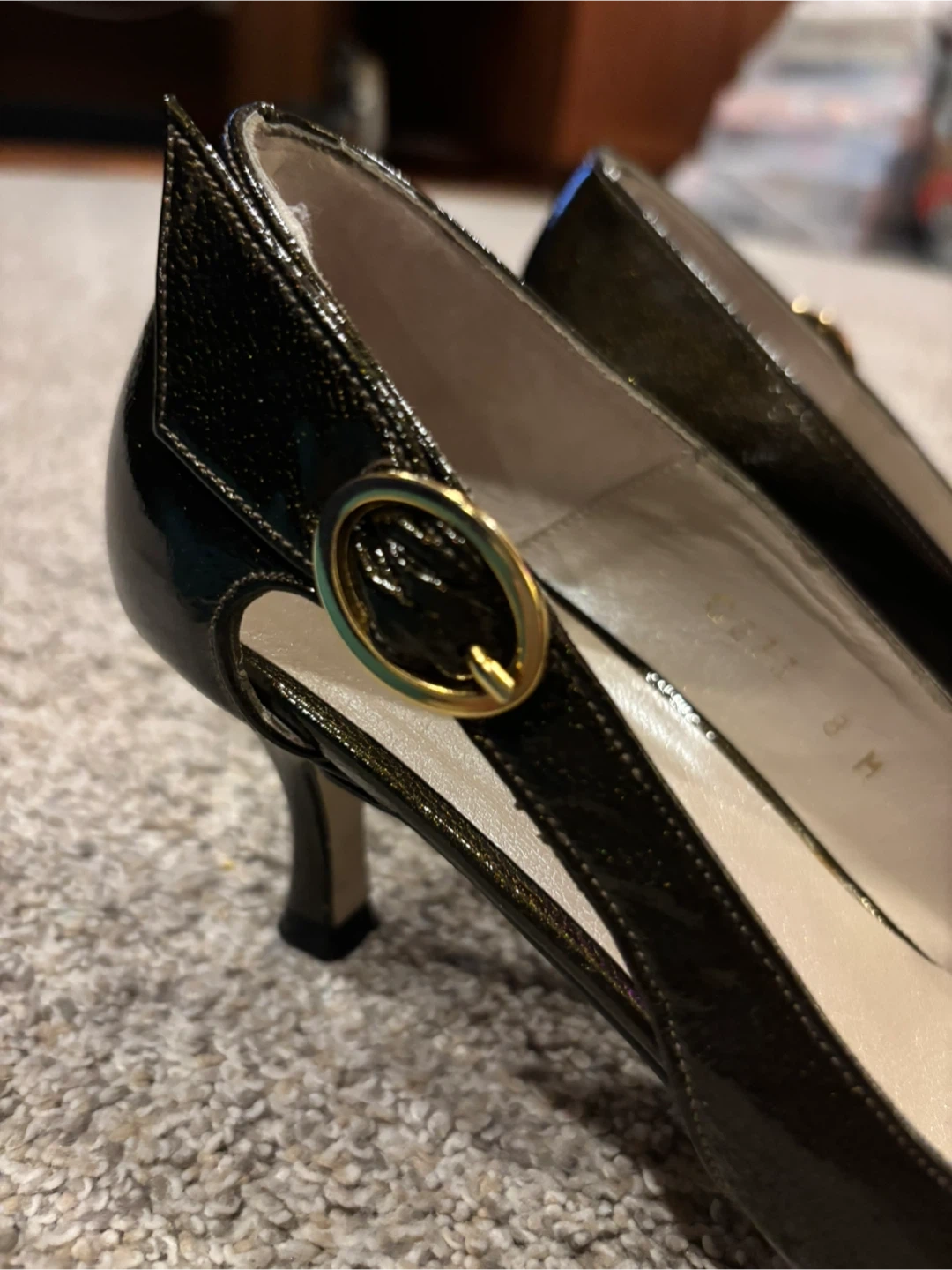 Franco Sarto heels in a dark, shimmering patent finish. Buckle detail on the side. These shoes are size 8 Medium. A classic choice for any occasion!