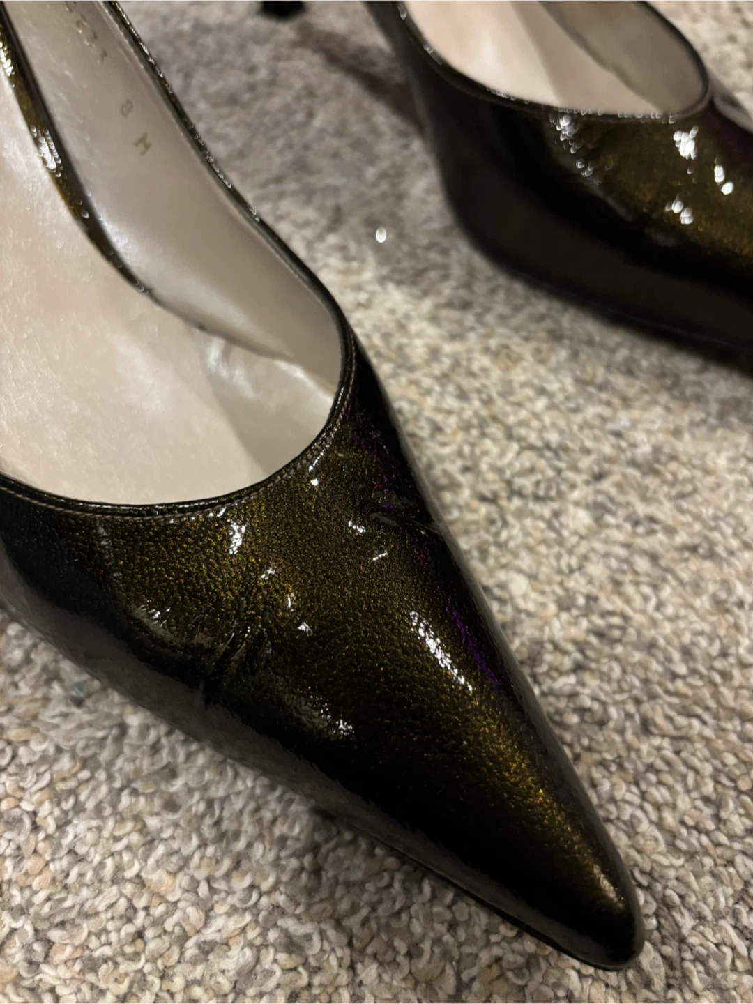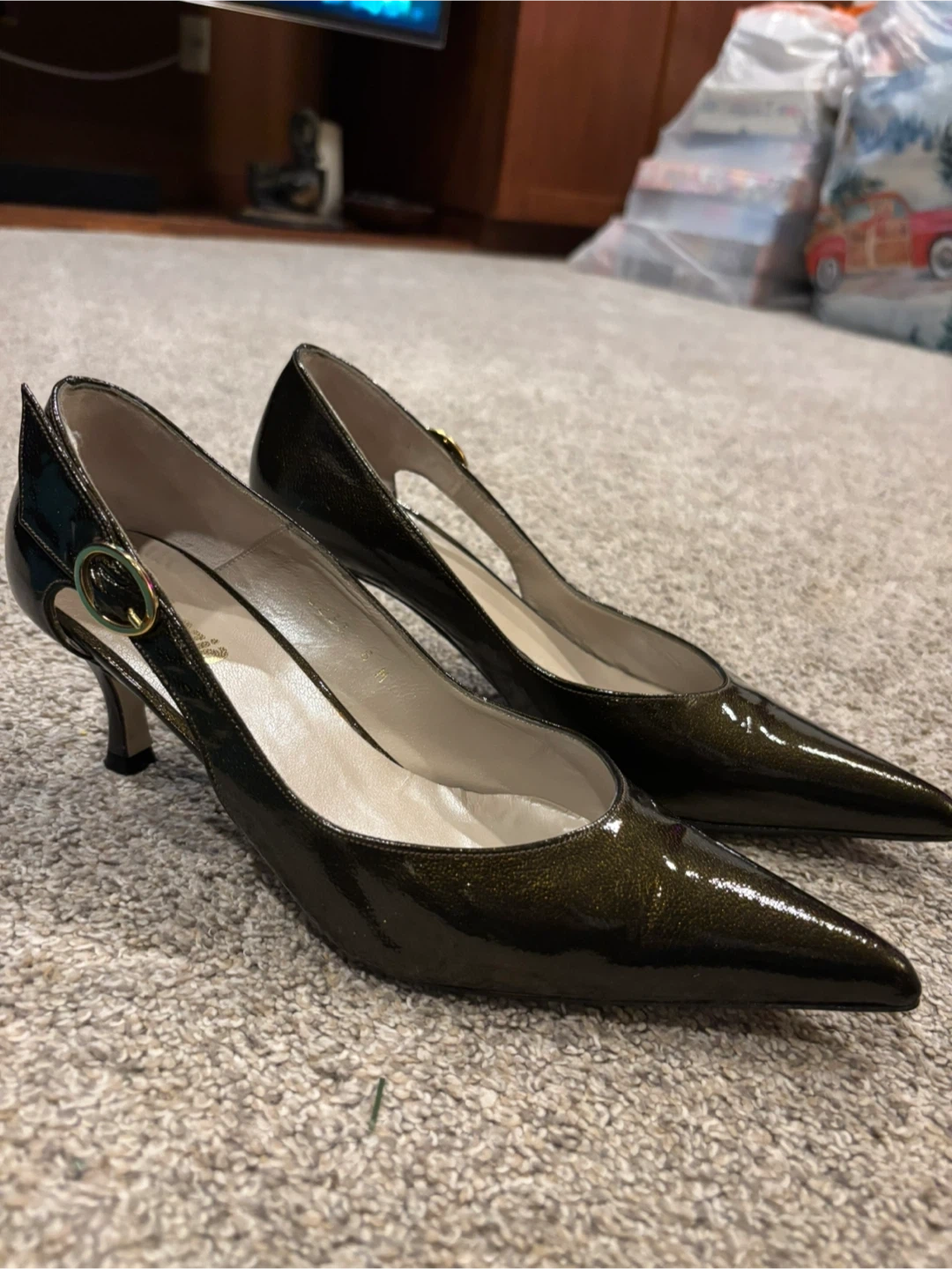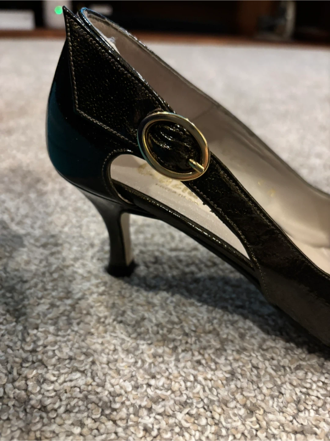 Franco Sarto heels in a dark, shimmering patent finish. Buckle detail on the side. These shoes are size 8 Medium. A classic choice for any occasion!