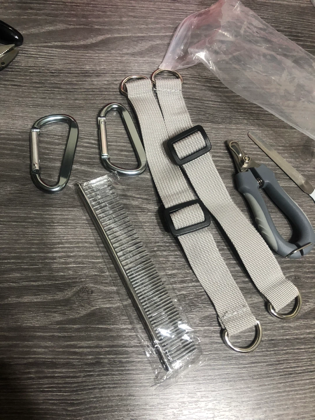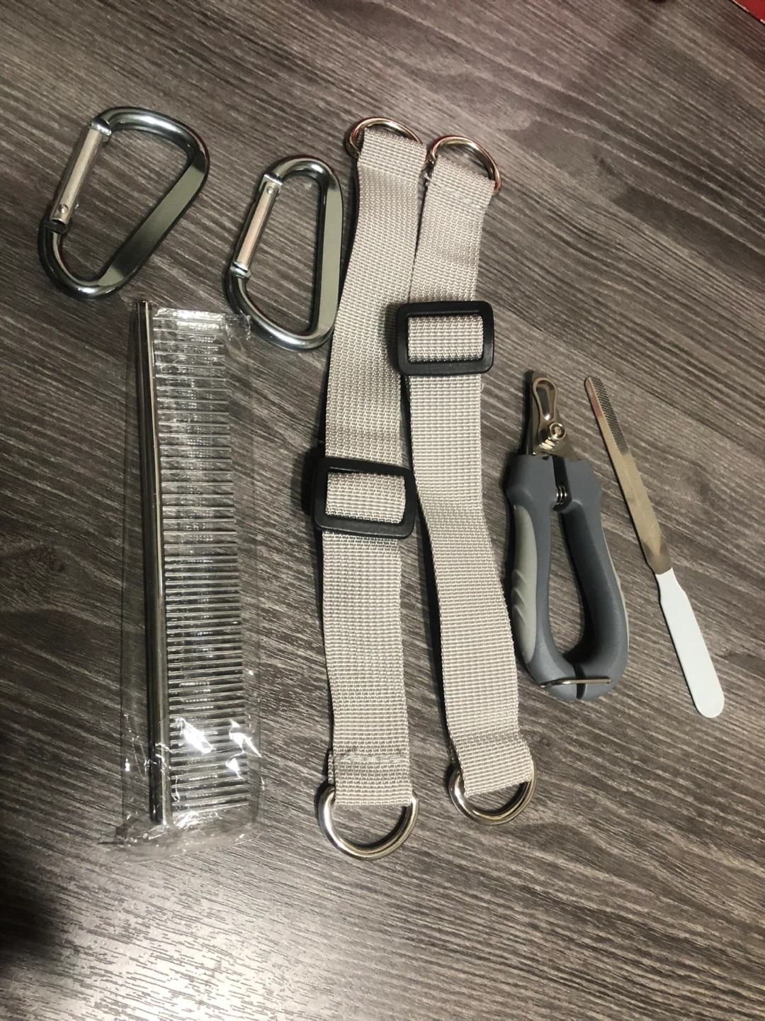 Selling a dog grooming kit with everything you need to keep your furry friend looking their best! The kit includes nail clippers, a comb, straps, and carabiners. Perfect for at-home grooming sessions!