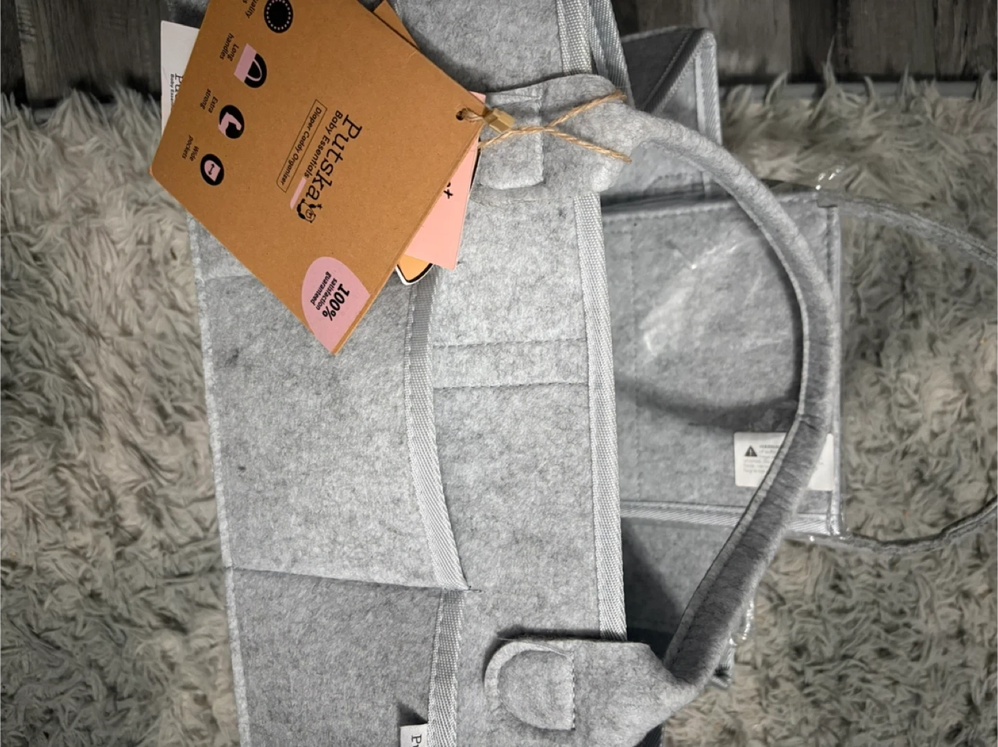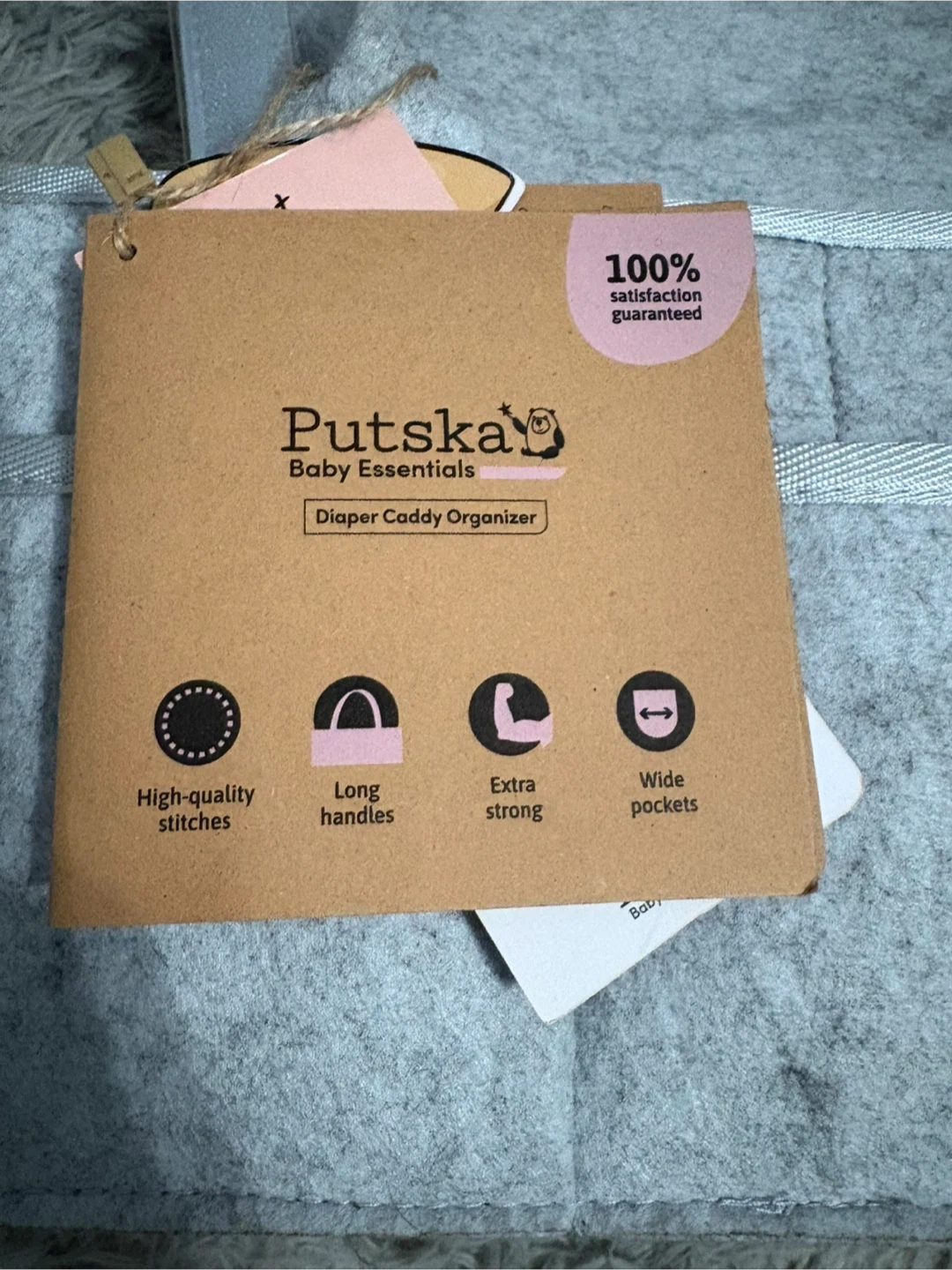This is a brand new Putskababy diaper caddy organizer! It's grey with long handles and wide pockets. The caddy also has high-quality stitches and is extra strong. It's a great way to keep all of your baby essentials organized and in one place