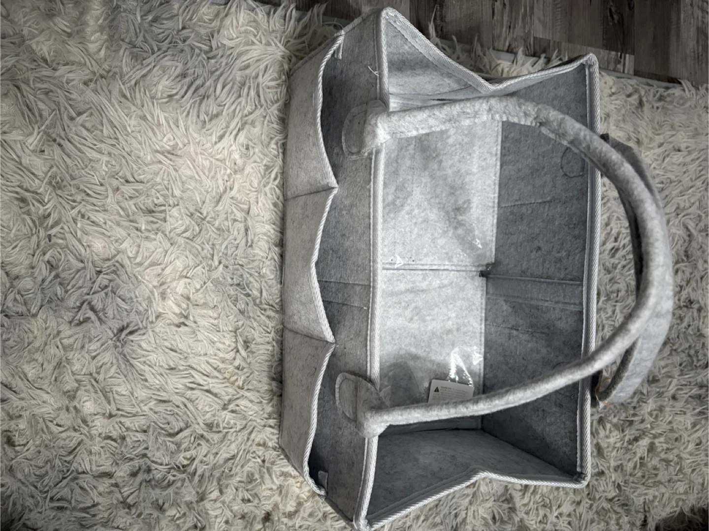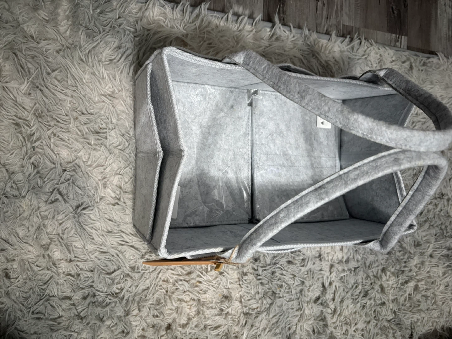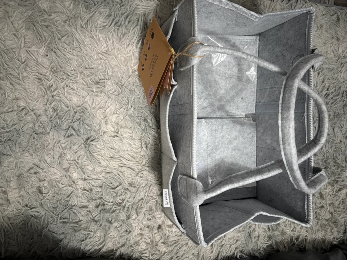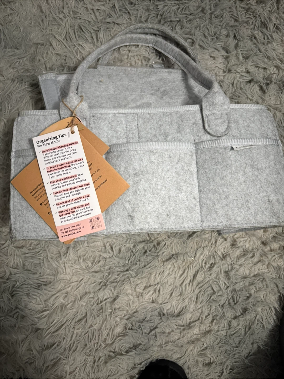 This is a brand new Putskababy diaper caddy organizer! It's grey with long handles and wide pockets. The caddy also has high-quality stitches and is extra strong. It's a great way to keep all of your baby essentials organized and in one place