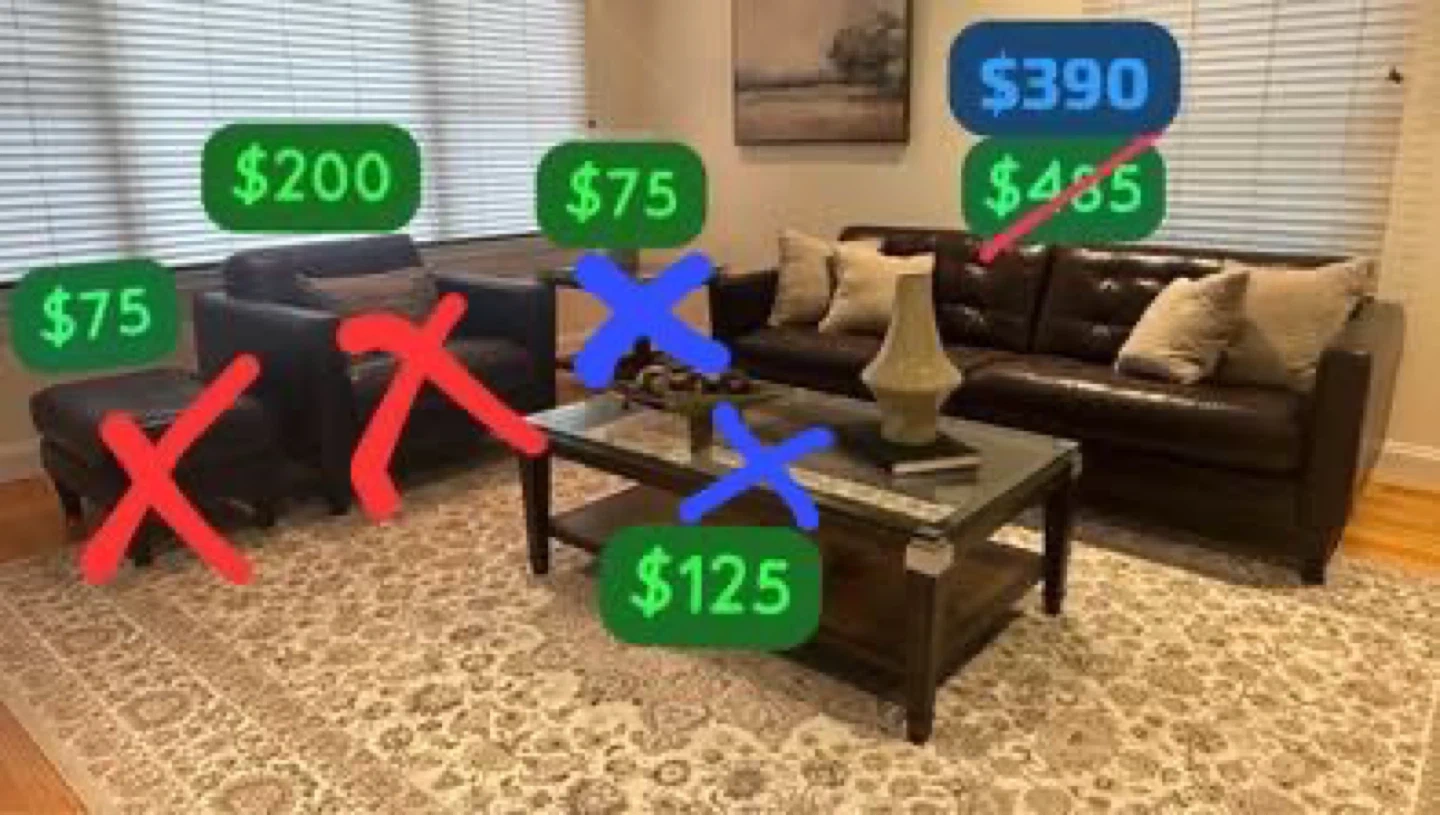 Selling a living room furniture set from Macy's, including a leather sofa, wooden coffee table with glass top, and a wooden end table with glass top. The set can be purchased all together or as individual pieces.
