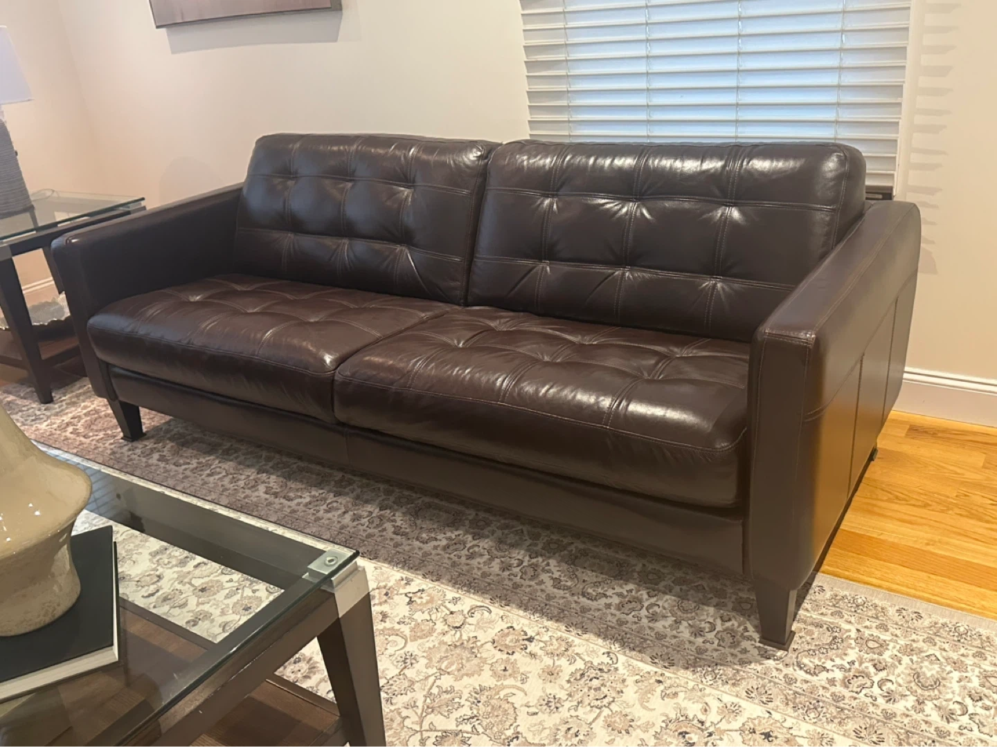 Selling a living room furniture set from Macy's, including a leather sofa, wooden coffee table with glass top, and a wooden end table with glass top. The set can be purchased all together or as individual pieces.