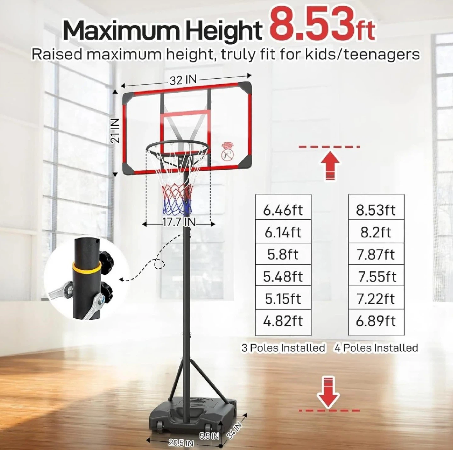 * Adjustable Height: Ranges from 4.82 to 8.53 feet.