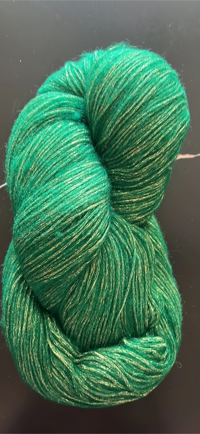 Green yarn with a gold metallic thread. Soft looking, presumably for knitting or crochet projects. Using it will give you an opportunity to practice your favourite calming hobby.