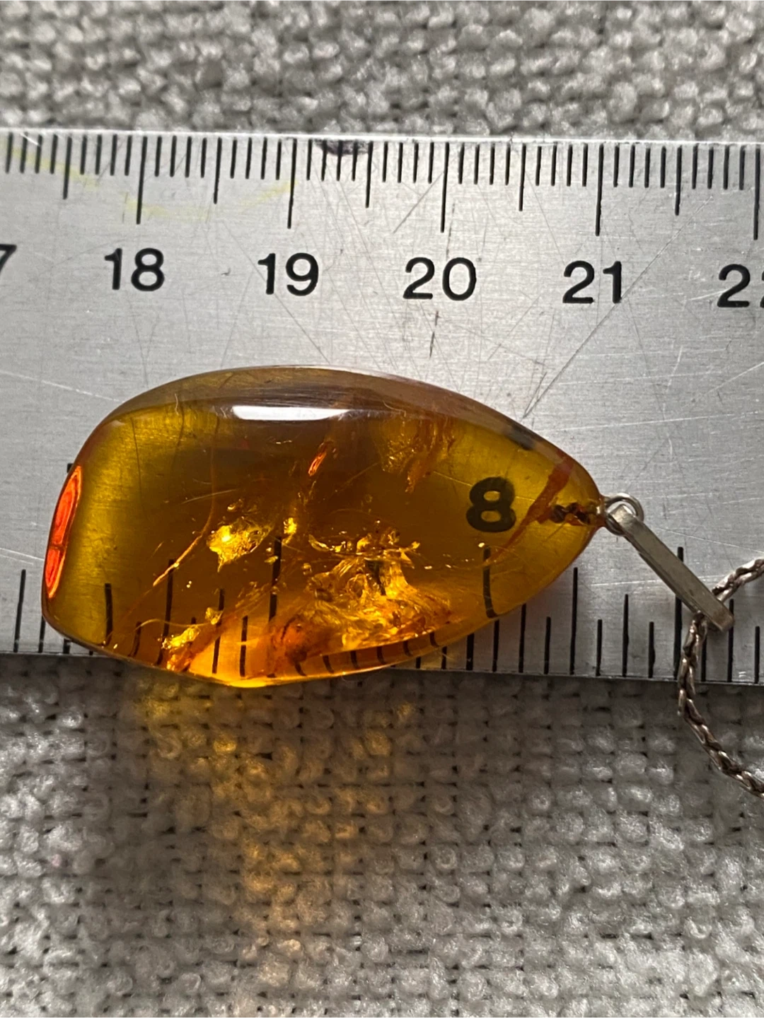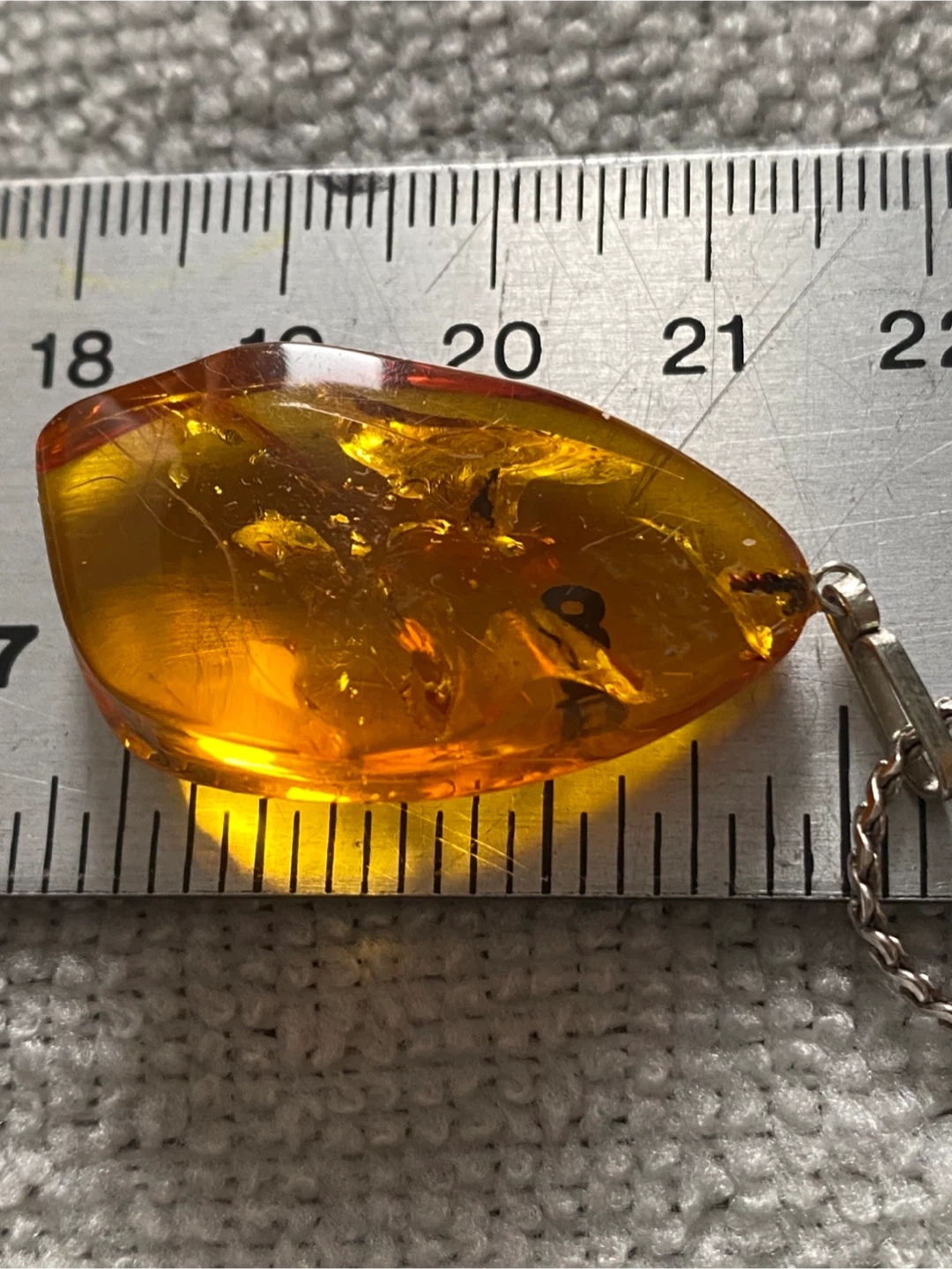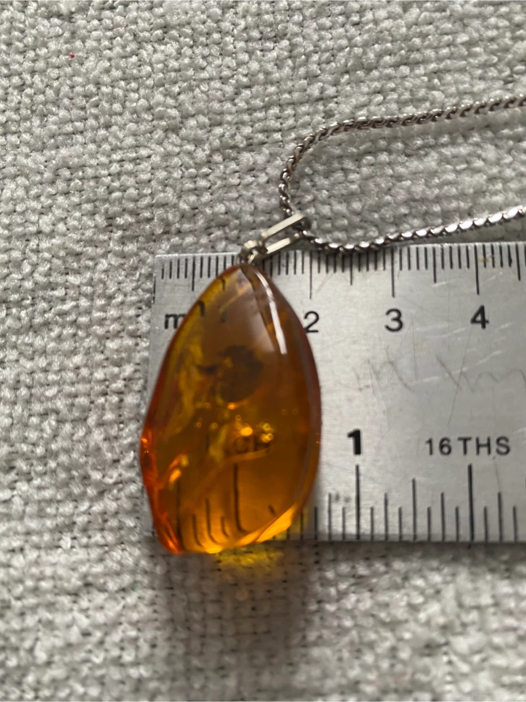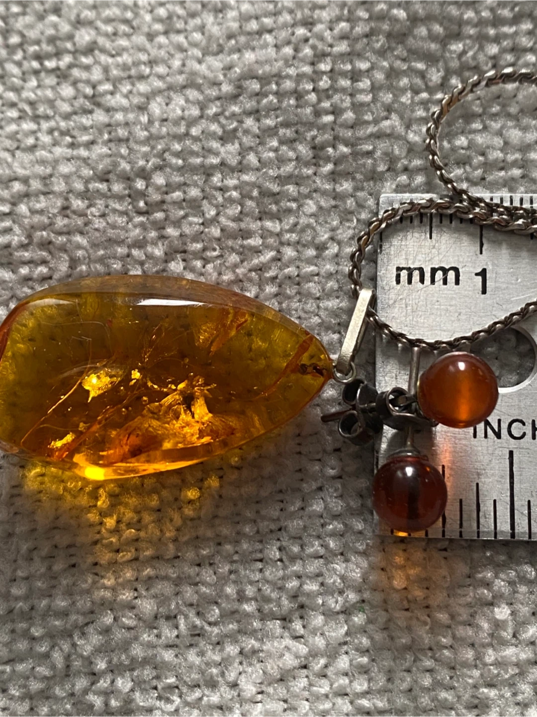 Antique Burma Amber pendant necklace featuring an insect inclusion.The pendant measures approximately 2.5 cm in length. Sterling silver chain included. $40 for pendant with chain and earrings.$ 35 without earrings