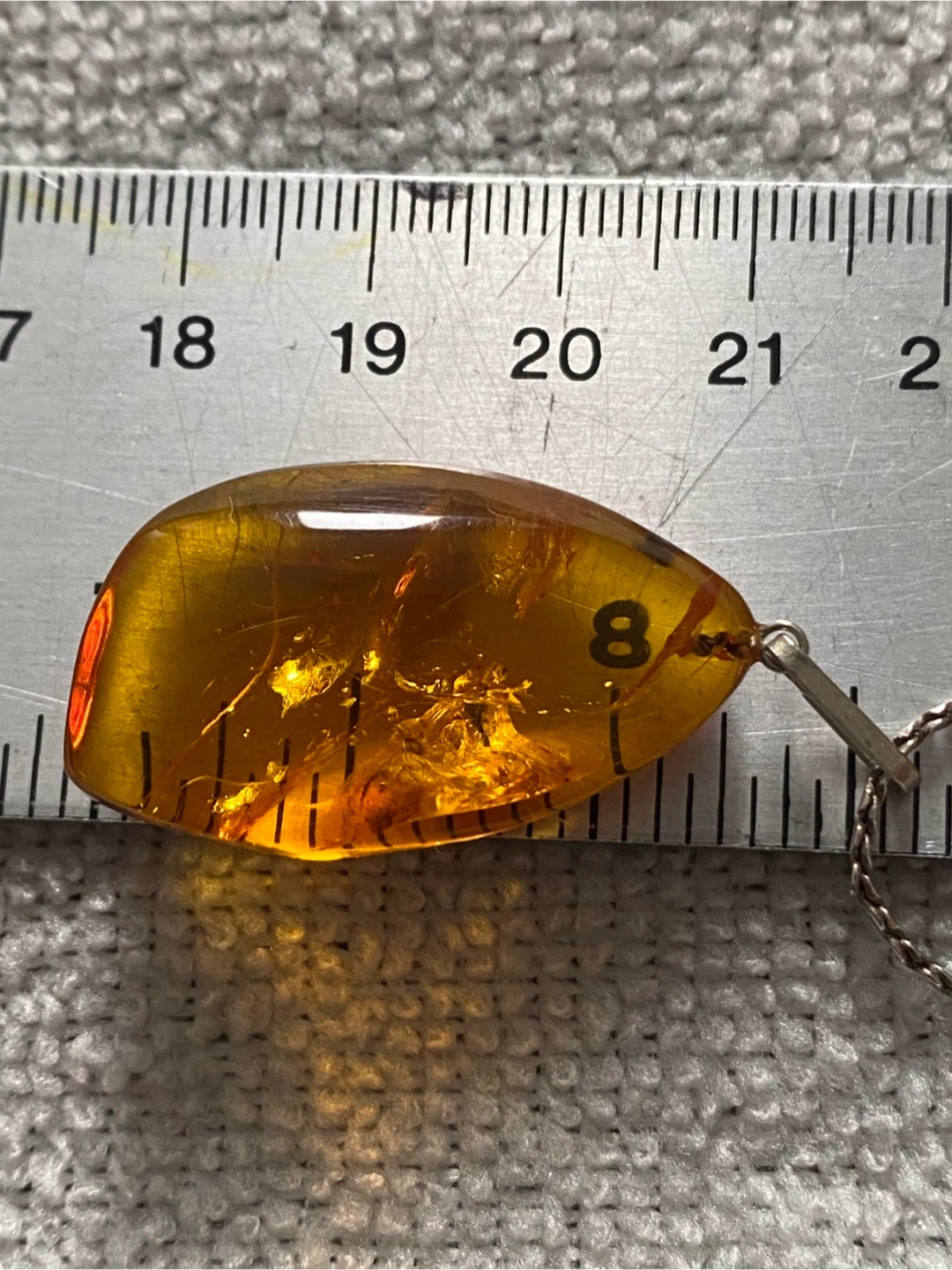 Antique Burma Amber pendant necklace featuring an insect inclusion.The pendant measures approximately 2.5 cm in length. Sterling silver chain included. $40 for pendant with chain and earrings.$ 35 without earrings
