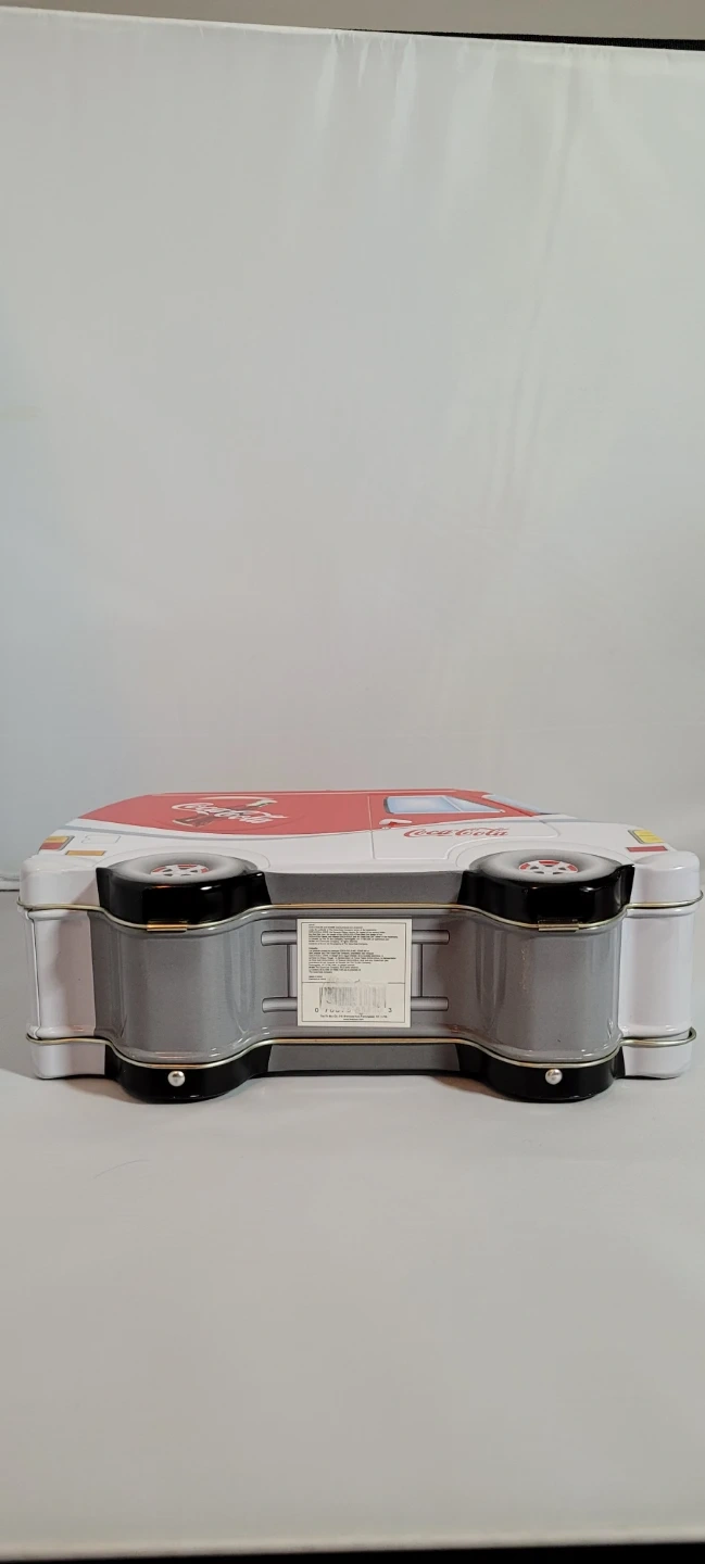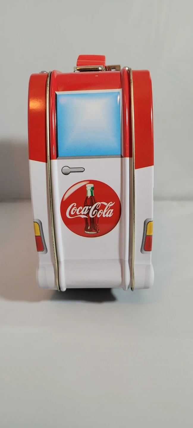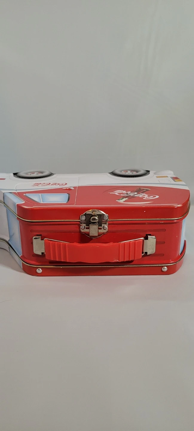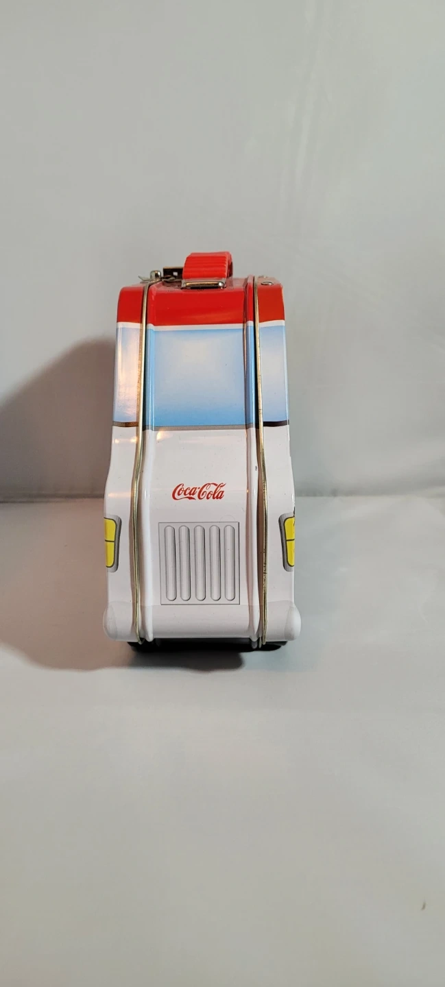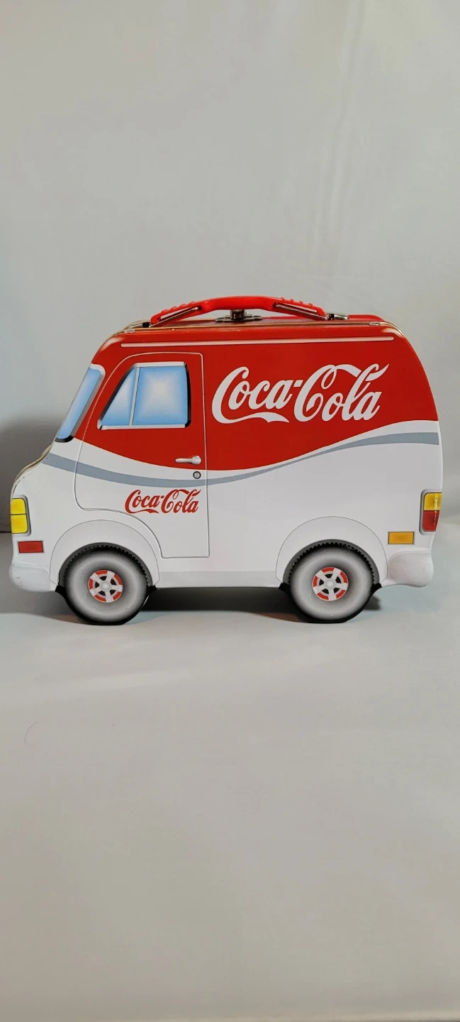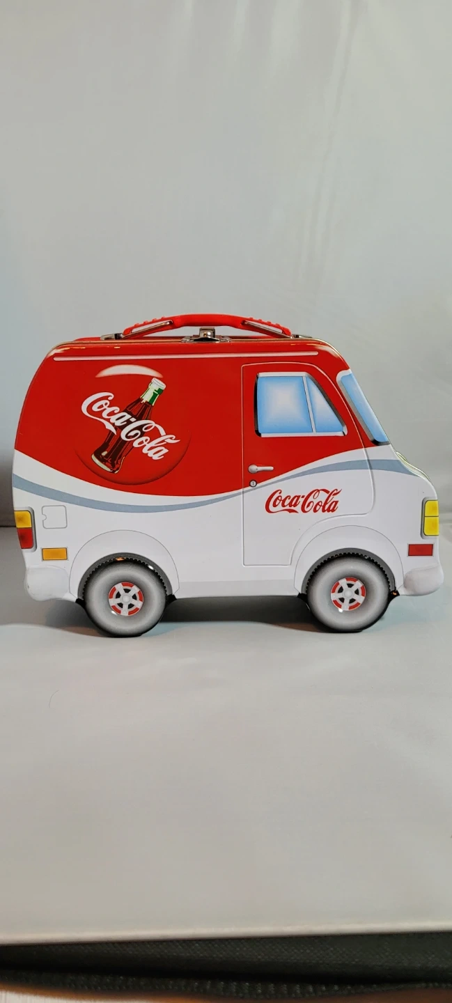 Coca-Cola branded tin box designed to look like a vintage van. It has a red and white exterior with the classic Coca-Cola logo. Metal construction with a handle on top for carrying.