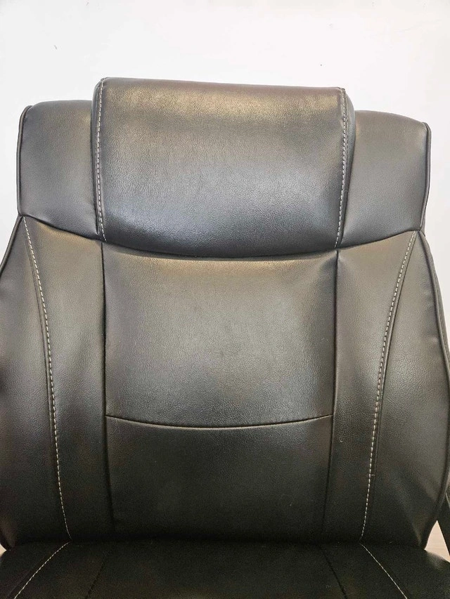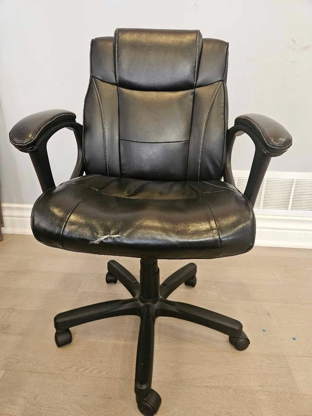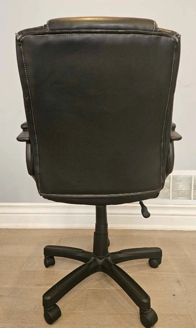 Adjustable height, smooth rolling wheels, and a cushioned seat and back support. Great for a home office or study. Shows some normal wear from use but is fully functional and comfortable.