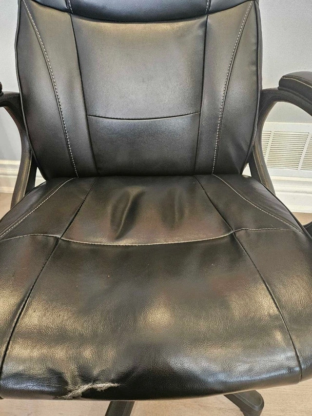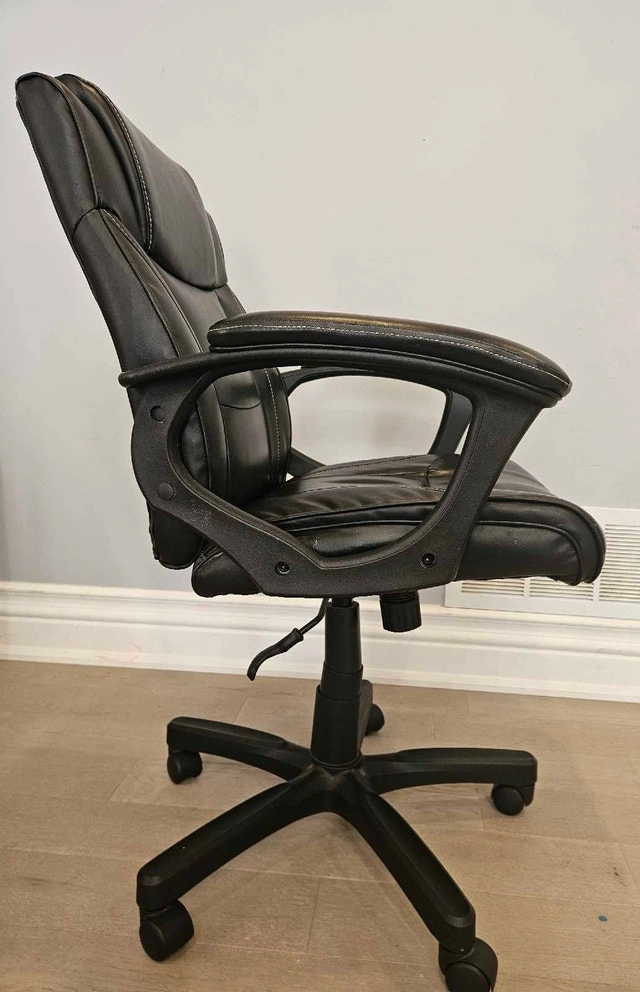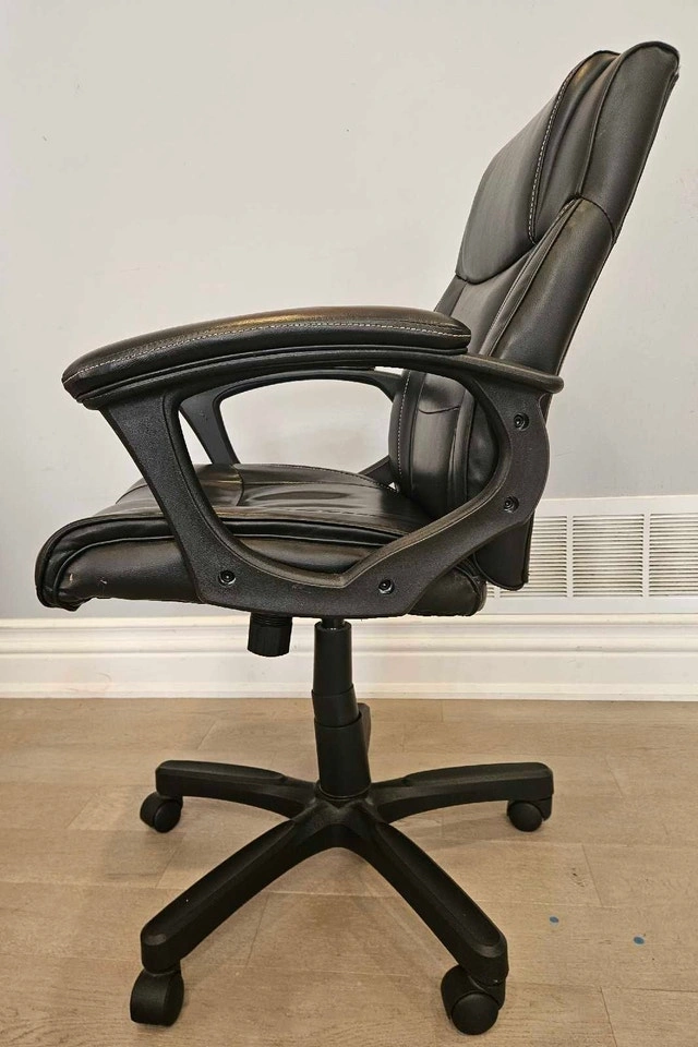 Adjustable height, smooth rolling wheels, and a cushioned seat and back support. Great for a home office or study. Shows some normal wear from use but is fully functional and comfortable.