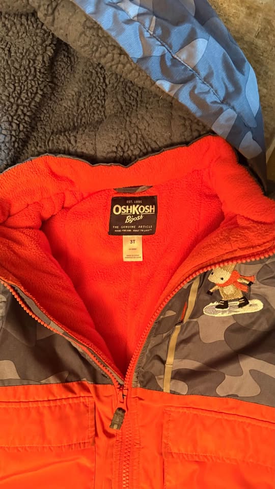 This is a warm, hooded winter jacket from OshKosh with a gray camouflage pattern and a bright orange zipper and front chest area. It has a soft, fleece-like lining in the hood that is light blue and grey.
