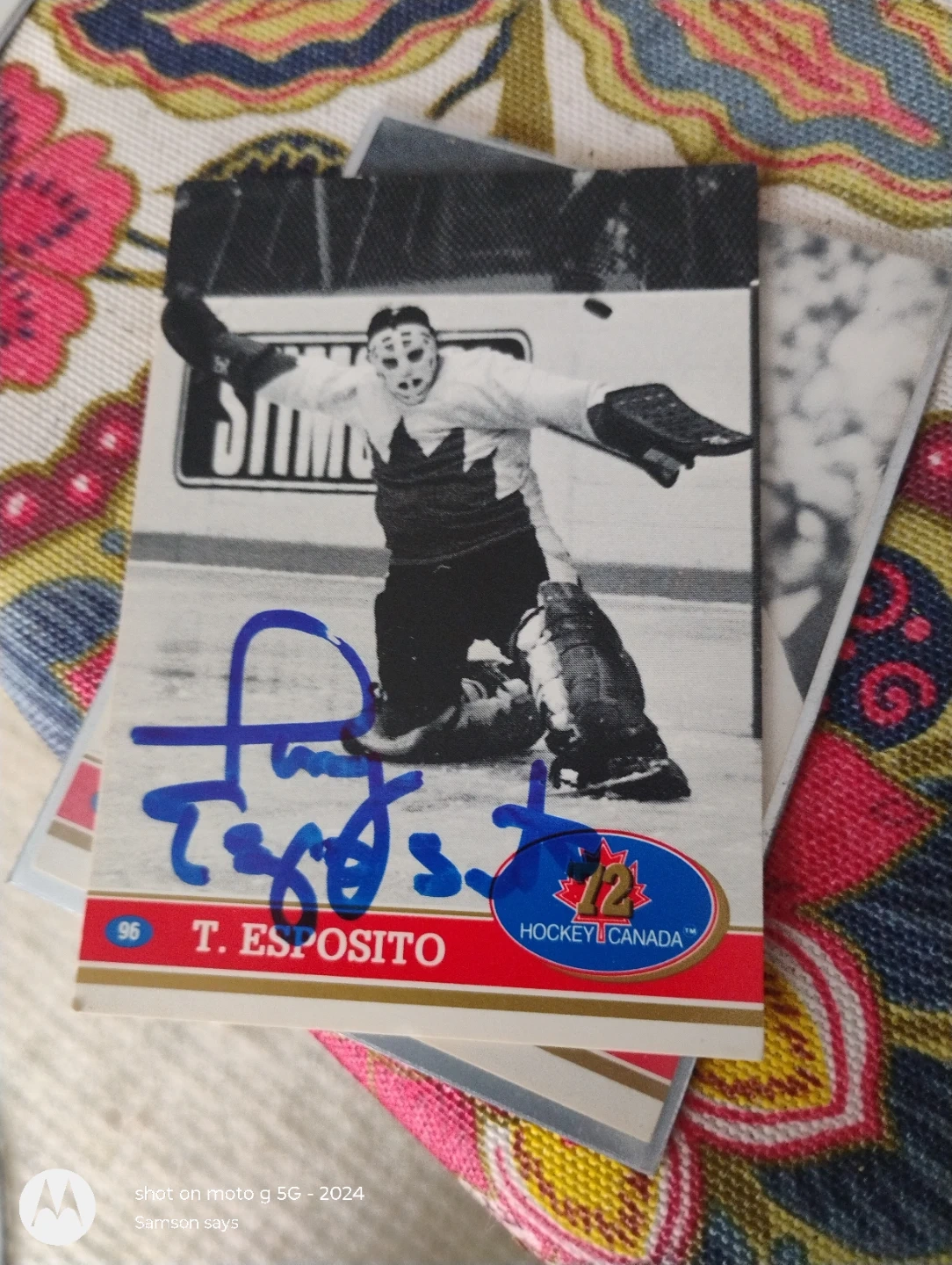This is a hockey card featuring T. Esposito. It's signed by the player. The card has the number 96 and the Hockey Canada logo.