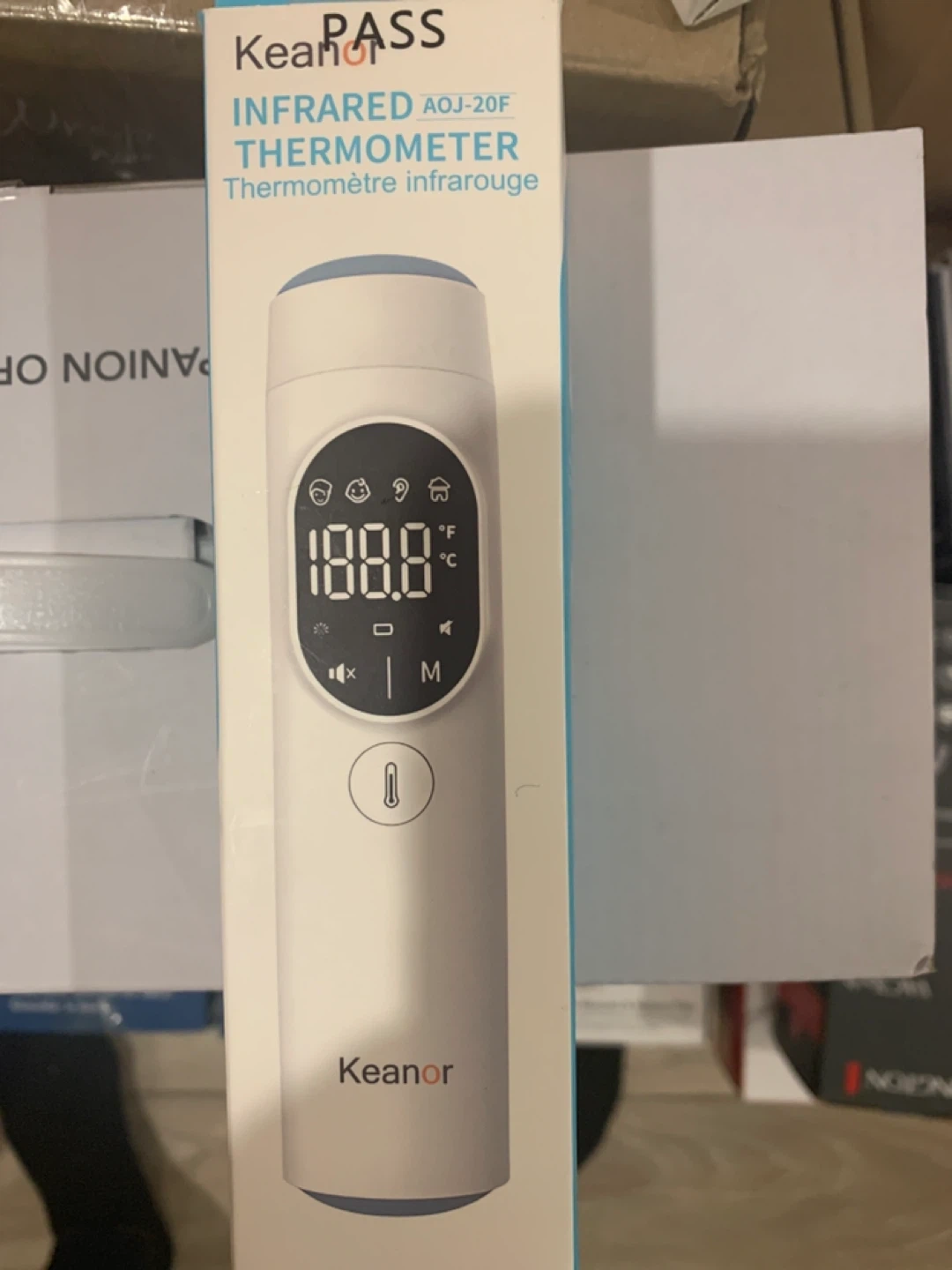 This is a Keanor AOJ-20F infrared thermometer. It's white and features a digital display for temperature readings in °C or °F. It also has modes for object and body temperature measurements.