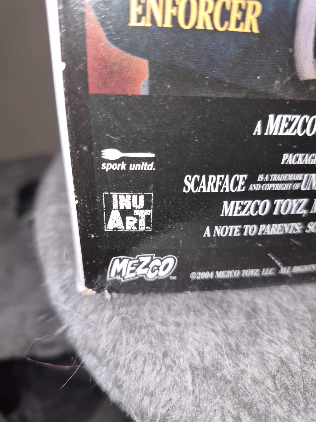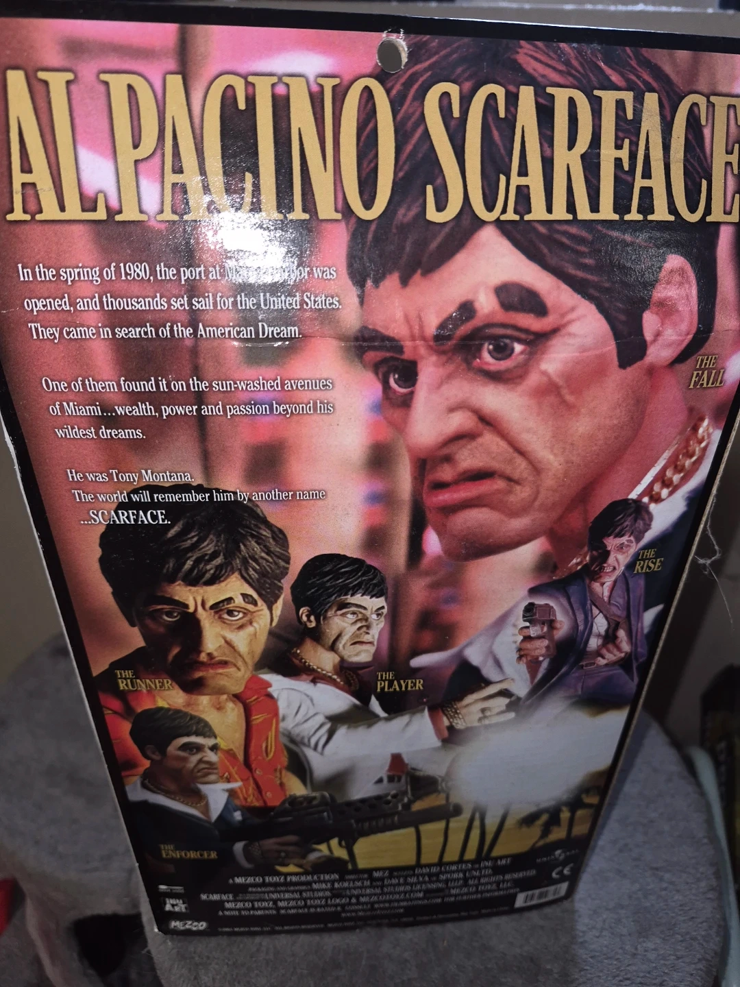 This is a Mezco Toyz 2004 action figure of Tony Montana from Scarface. It comes in its original packaging. This figure depicts the iconic character played by Al Pacino.