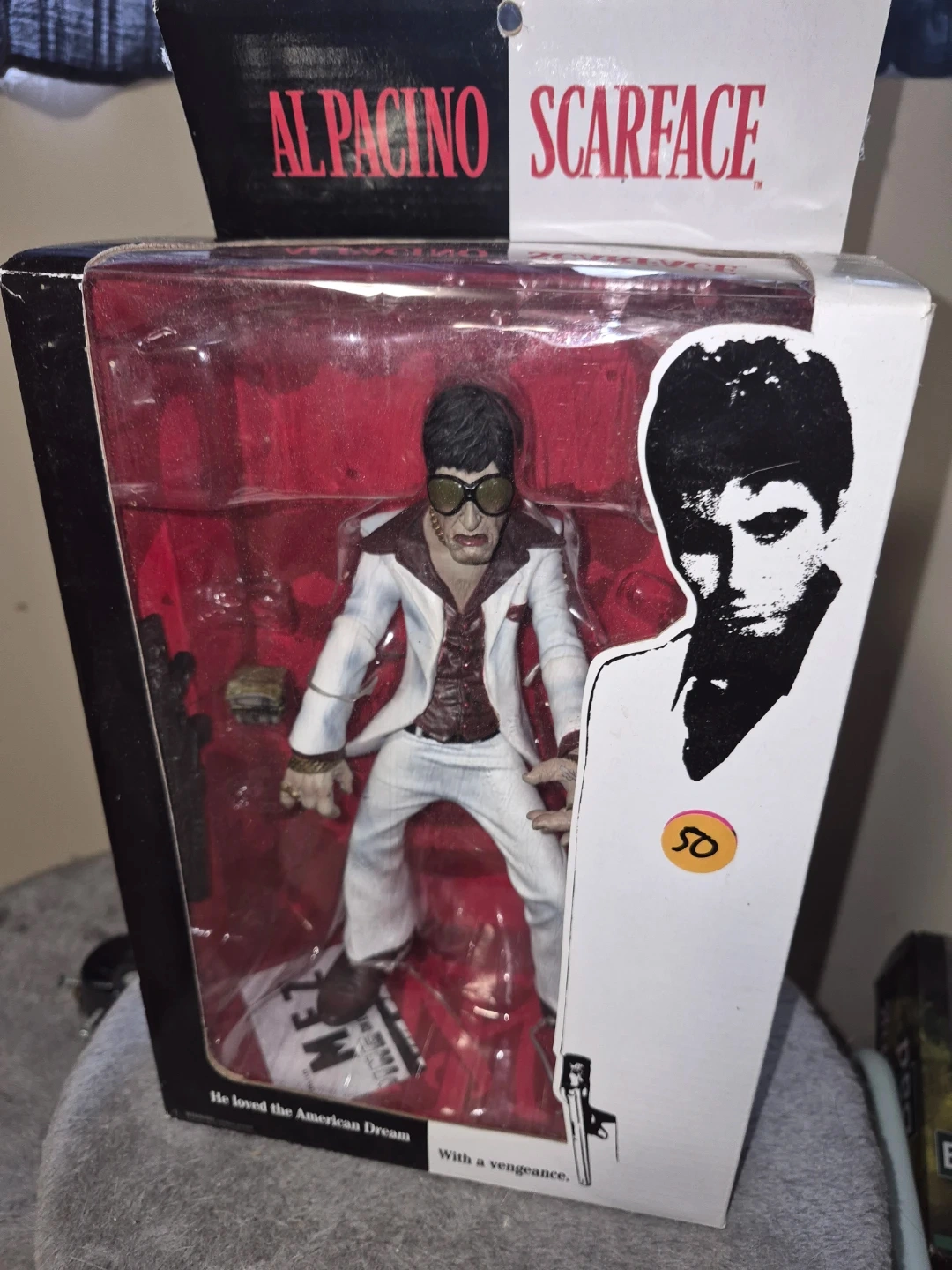 This is a Mezco Toyz 2004 action figure of Tony Montana from Scarface. It comes in its original packaging. This figure depicts the iconic character played by Al Pacino.