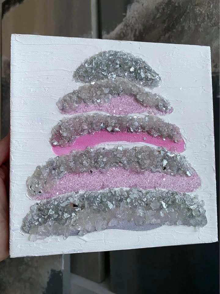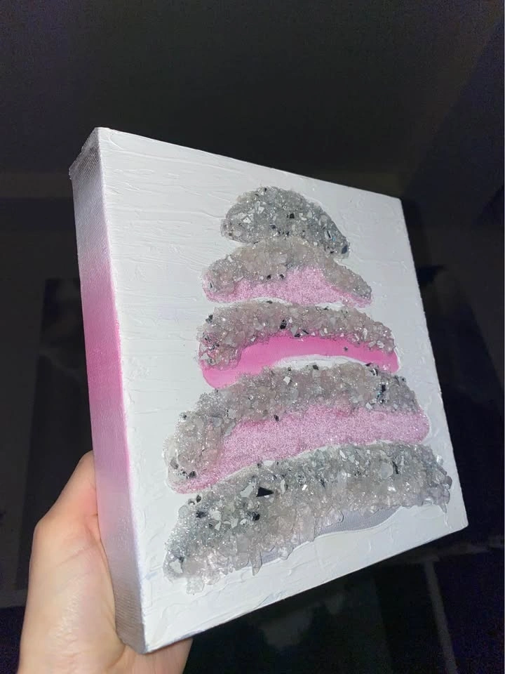 Attract healing, love and success with this rose quartz and clear quarts crystal canvas painting. The video is more accurate with the shine, the pictures do not do justice. 8x8 inch Canvas painting Modelling paste, rose quartz crystal, clear quartz, glass, reflective glitter, resin. Made by myself, the artist! Ready to pick up! π