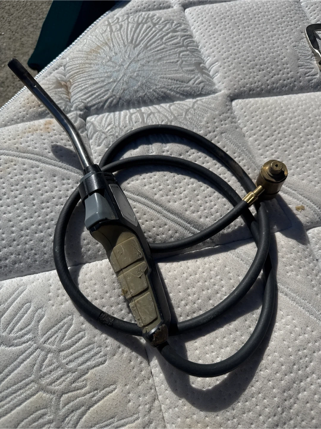 Propane torch with a flexible hose. Includes a brass fitting for connecting to a propane tank. Ready for use with your existing tank.