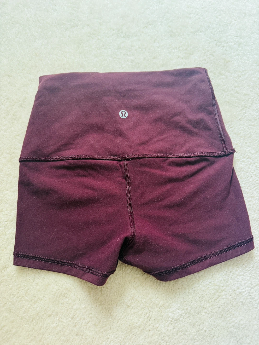 Here are some Lululemon athletic shorts! They are in great condition and ready for a new home. The colour is a nice burgundy. Perfect for working out or just lounging around the house!