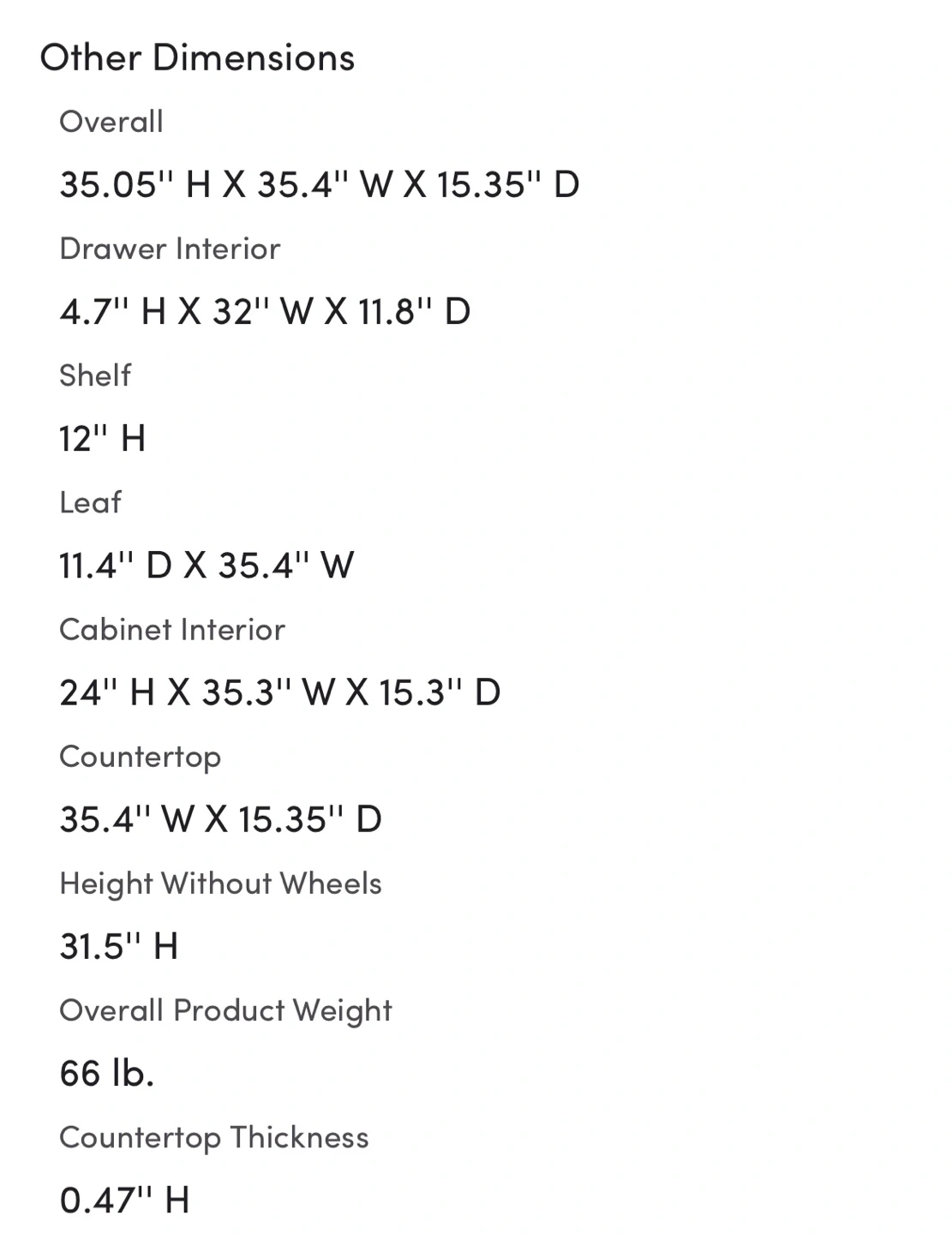 - Cabinet Interior: 24" H x 35.3" W x 15.3" D