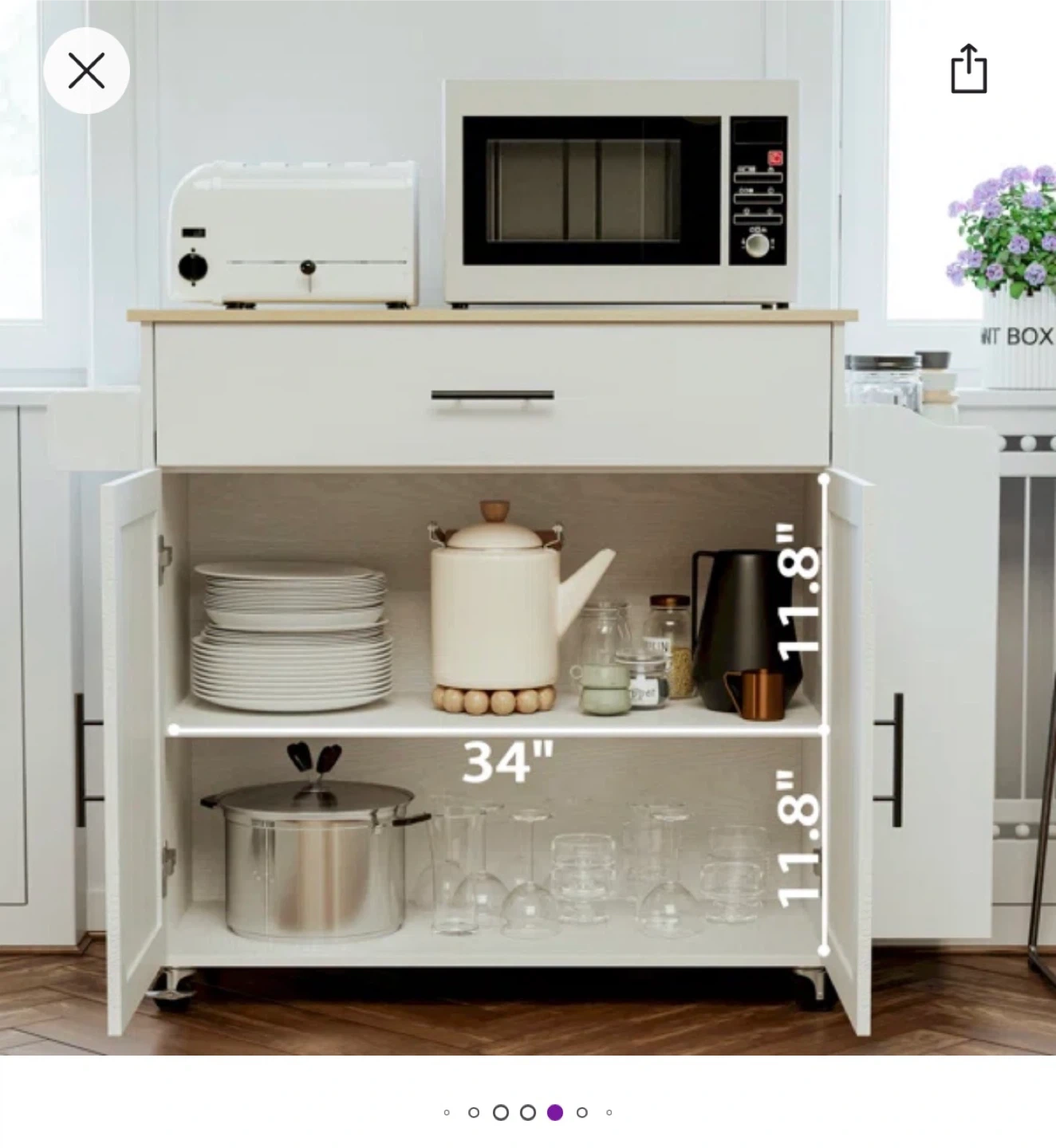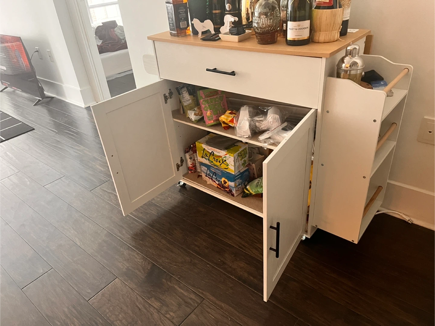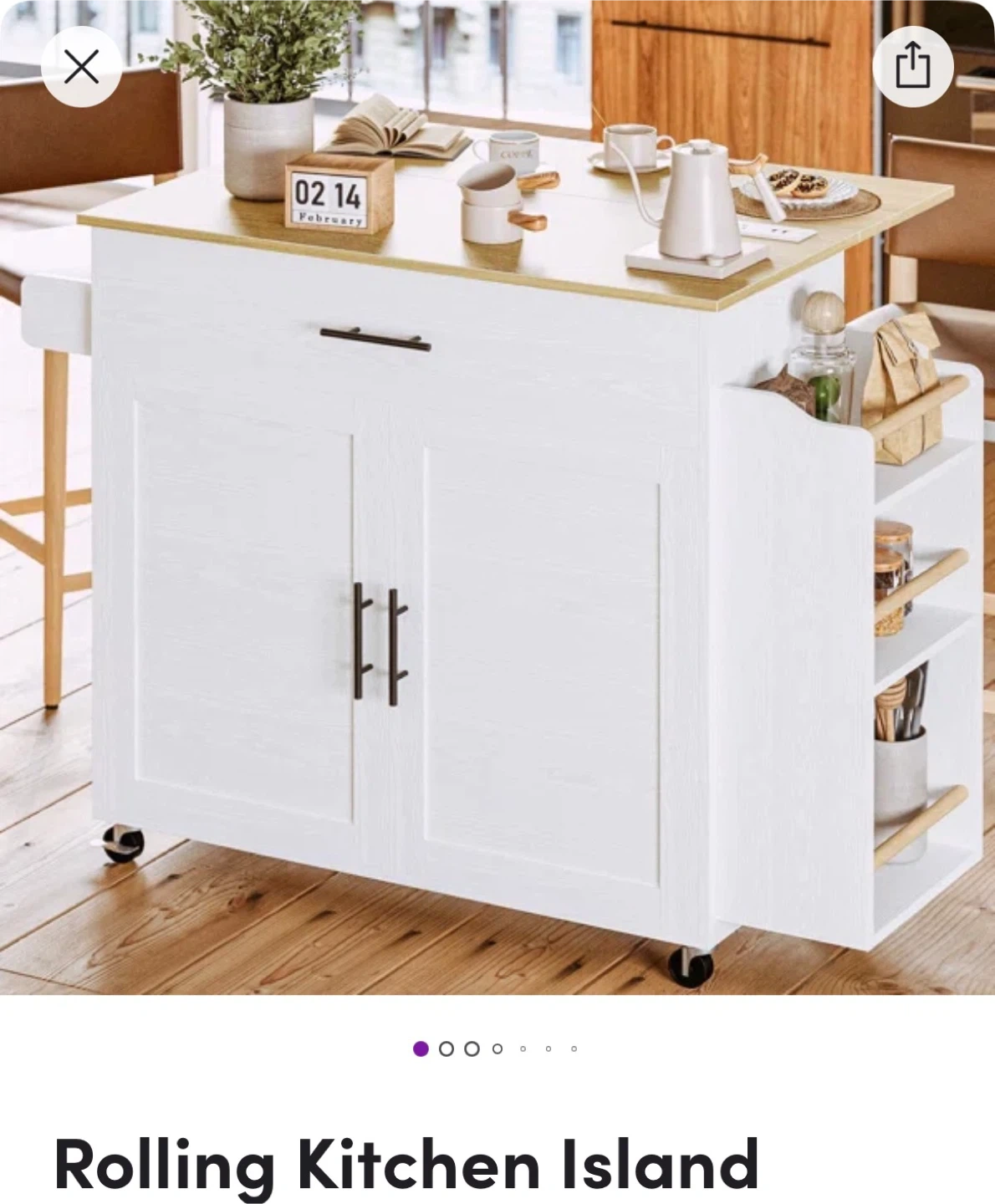 I'm selling a rolling kitchen island, perfect for adding extra counter space and storage to your kitchen. It features a white cabinet base with a light wood countertop.