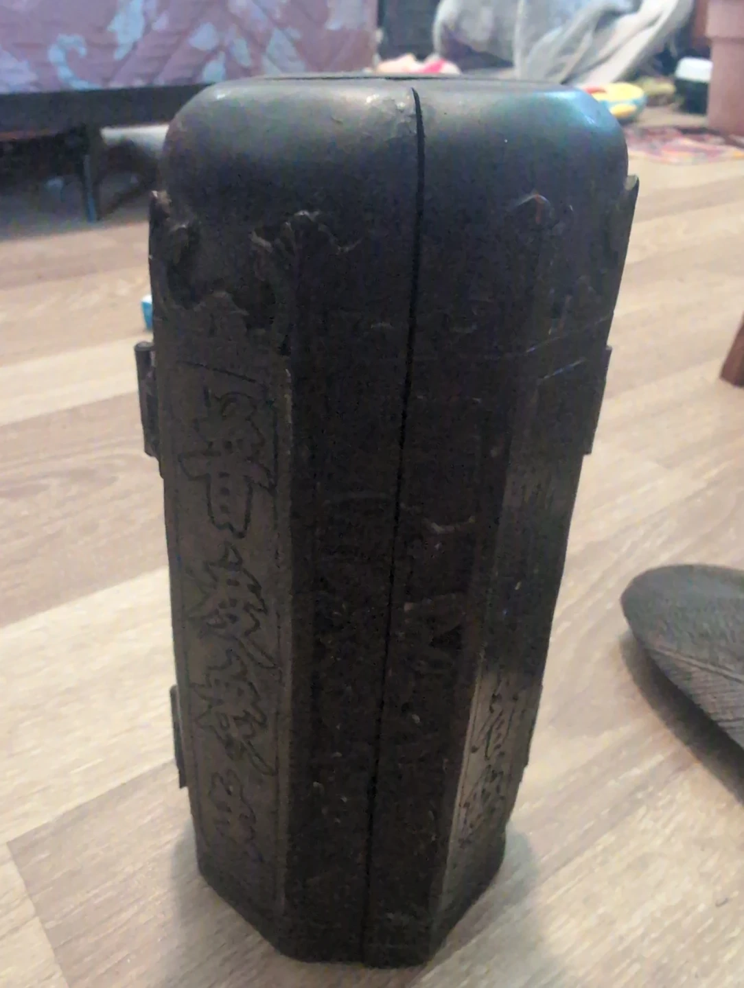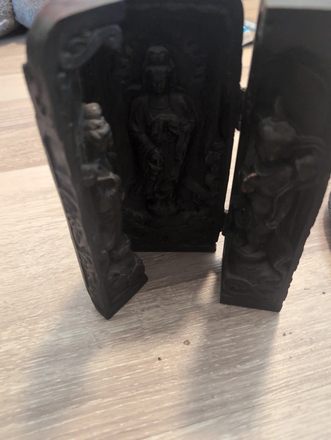 This is a vintage decorative triptych with intricate carvings. It opens to reveal multiple figures. The piece appears to be made of dark wood or a similar material.