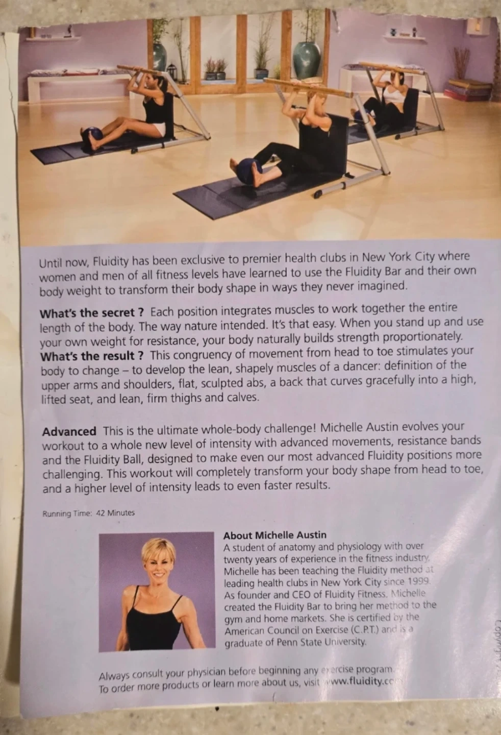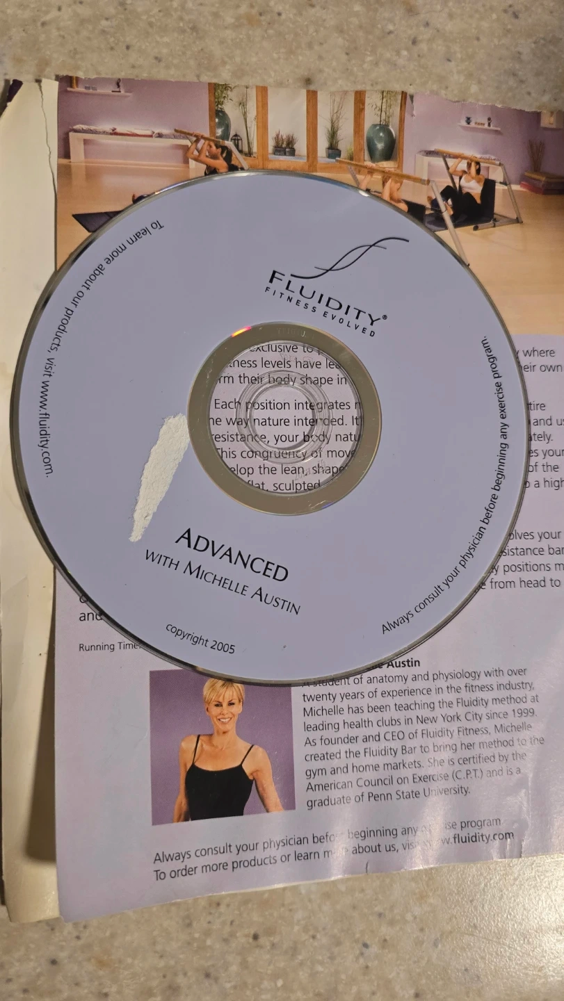 This is the Fluidity Fitness Advanced workout DVD with Michelle Austin. It's designed to transform your body shape with advanced movements and resistance bands. The running time is 42 minutes.