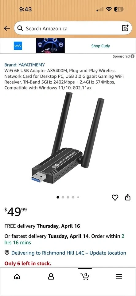 Boost your internet speed with this high-performance WiFi 6E USB Adapter. It is Brand New, never used, and still in its original condition. I am offering it for a great price! Price: $20 (Firm). Condition: Brand New / Never Used. Key Features: Next-Gen WiFi 6E: Supports 2.4GHz, 5GHz, and the new 6GHz band for less interference. High Speed (AX5400): Up to 2402Mbps on 5GHz/6GHz—perfect for lag-free gaming and 4K streaming. USB 3.0 Interface: 10x faster than USB 2.0. Plug & Play: Compatible with Windows 11/10 (No complex setup required). Dual High-Gain Antennas: Ensures a strong and stable signal throughout your room. Location: Richmond Hill. Pickup: Ready for immediate pickup.