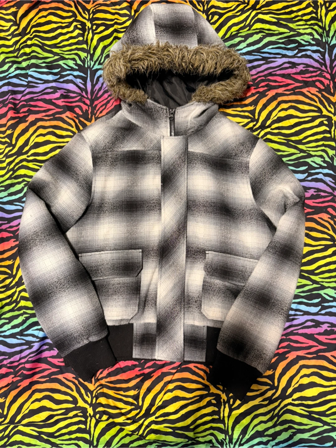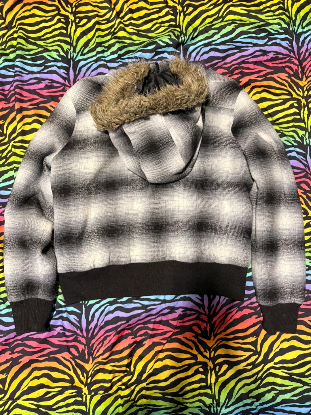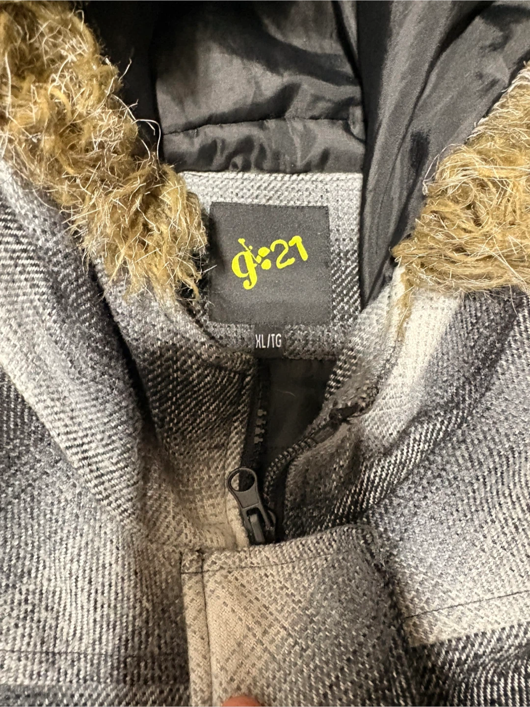 This G21 jacket features a plaid pattern with a faux fur-lined hood. It's a size XL/TG but fits more like medium The jacket has a zip-up front and two front pockets.
