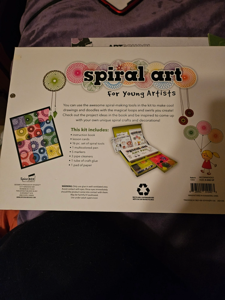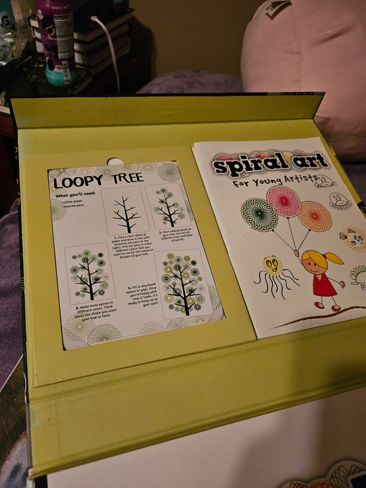 spiral art kit. Includes instruction book, spiral-making tools, and craft paper. Create cool drawings and doodles. 26 projects to make. it has never been used, but is missing the markers, and the pen