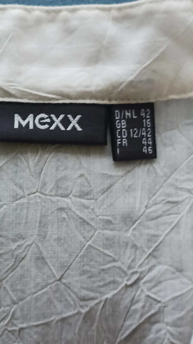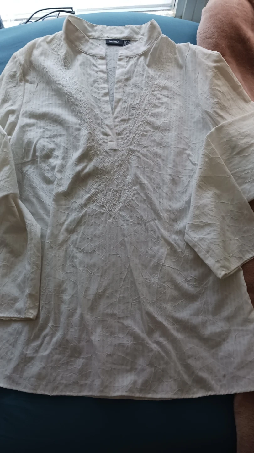 This is a white Mexx tunic top with embroidered detailing on the neckline. It's a size 12 in UK sizing and 42 in European sizing. The material appears to be a lightweight, textured fabric. Beautiful and comfortable to wear!