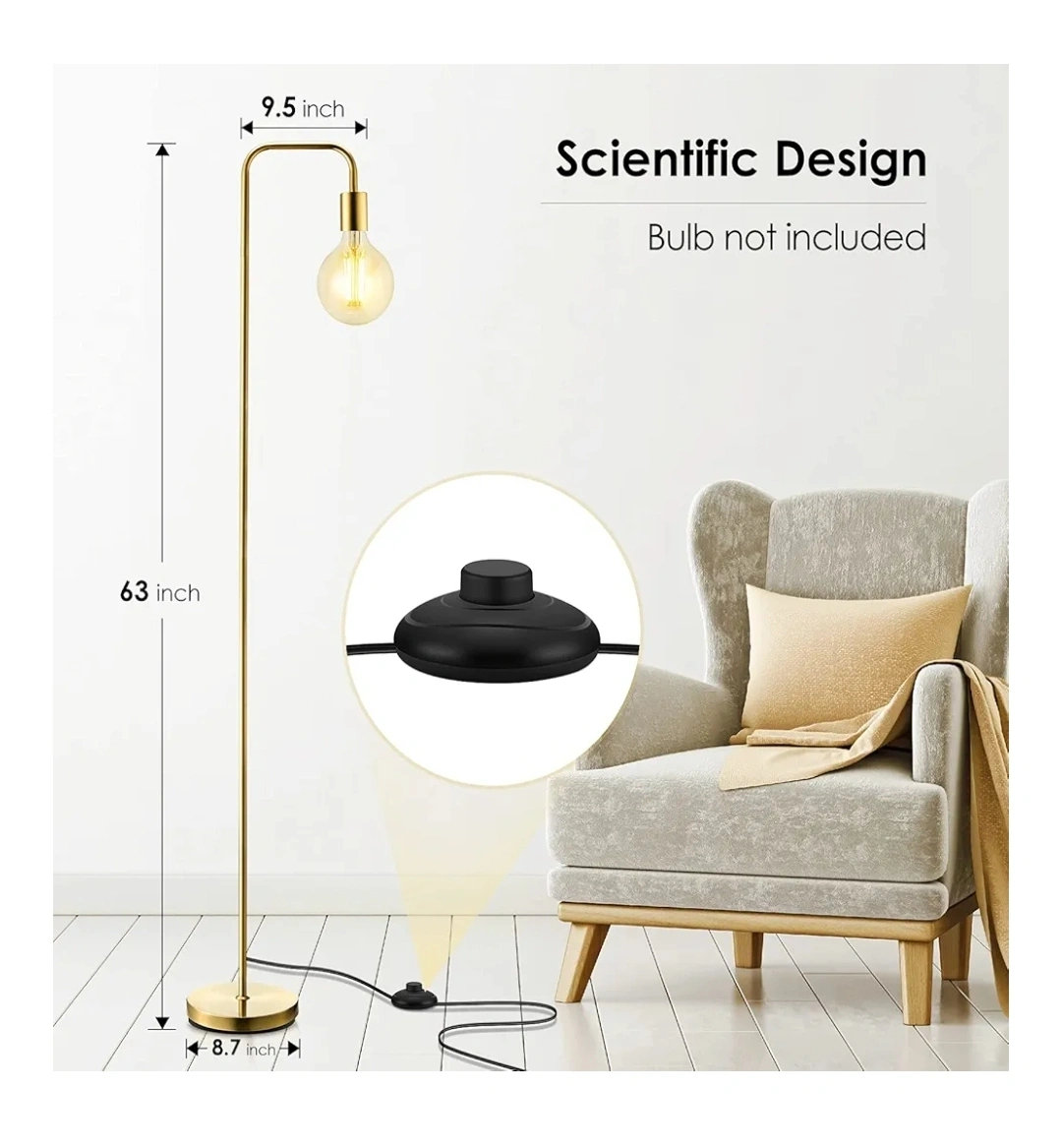 I'm selling a stylish gold floor lamp that stands 63 inches tall. The base is 8.7 inches in diameter, and the arm extends 9.5 inches. Please note that the bulb is not included, so you can choose your favorite style to match your decor