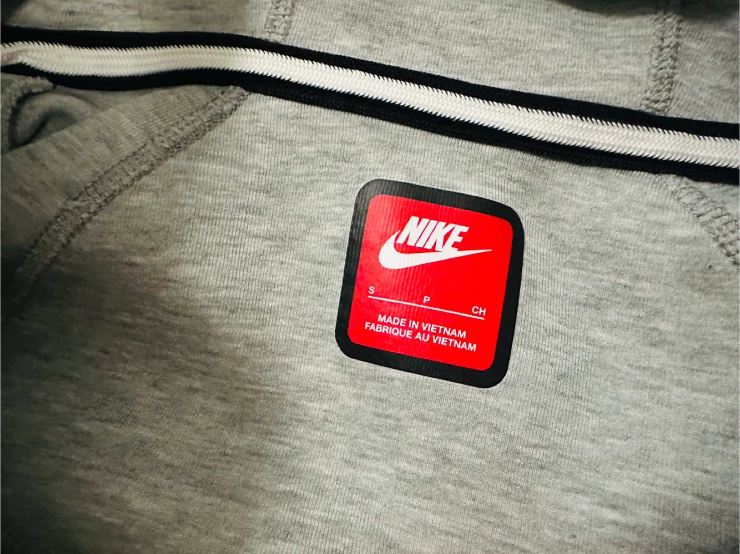 Grey Nike Tech Fleece tracksuit. Includes a hooded zip-up jacket and matching sweatpants. Made in Vietnam. Size S.