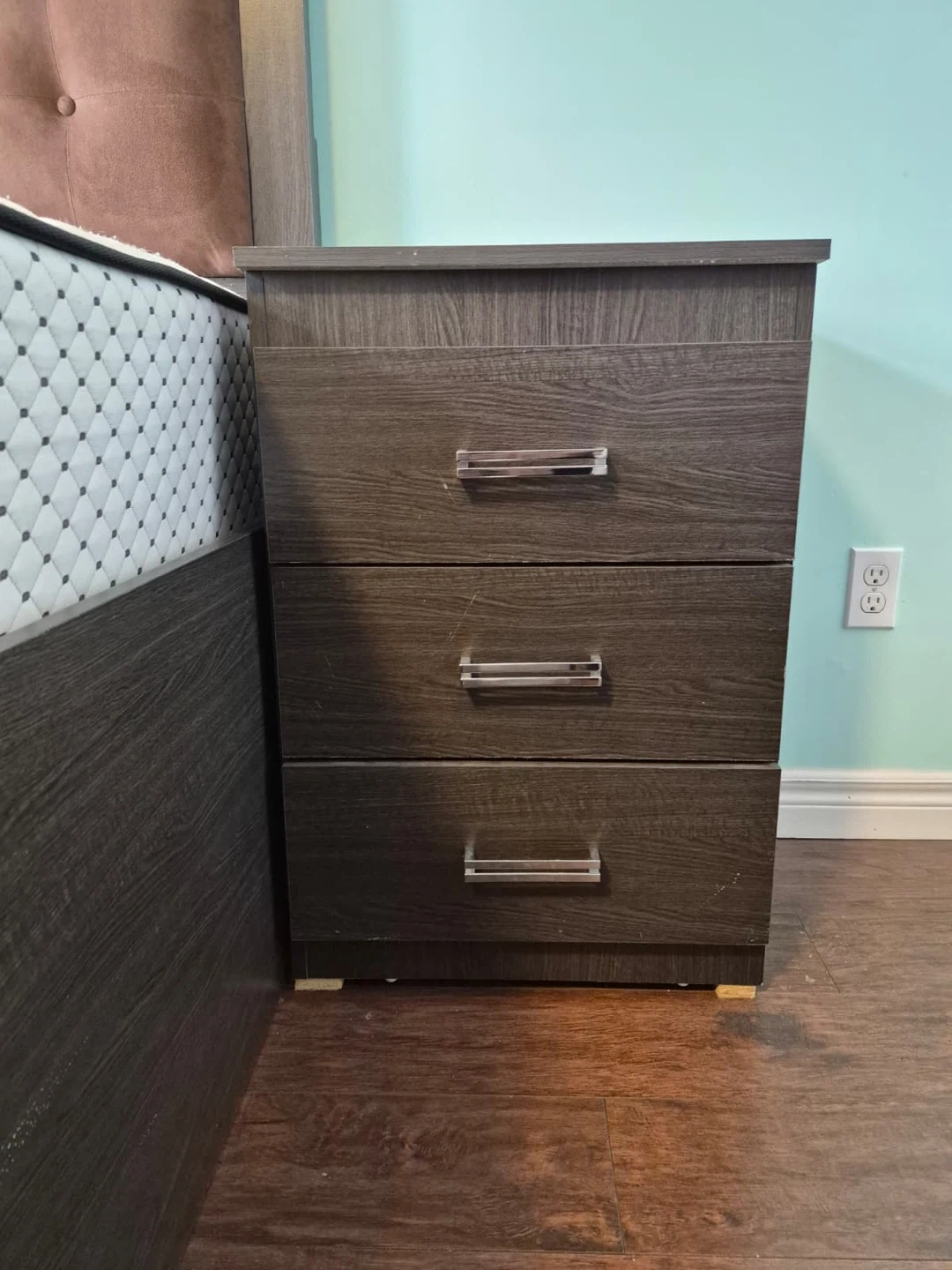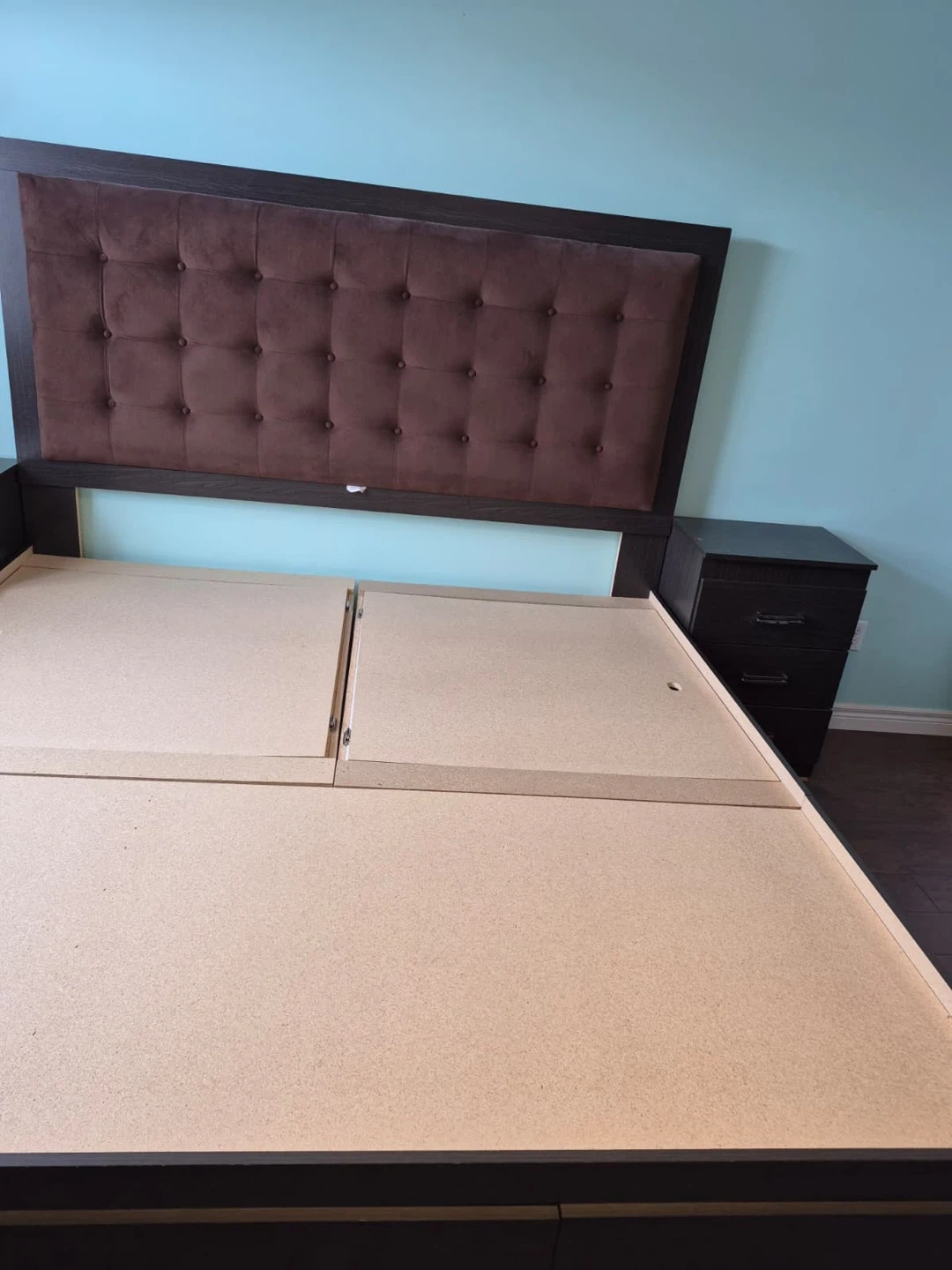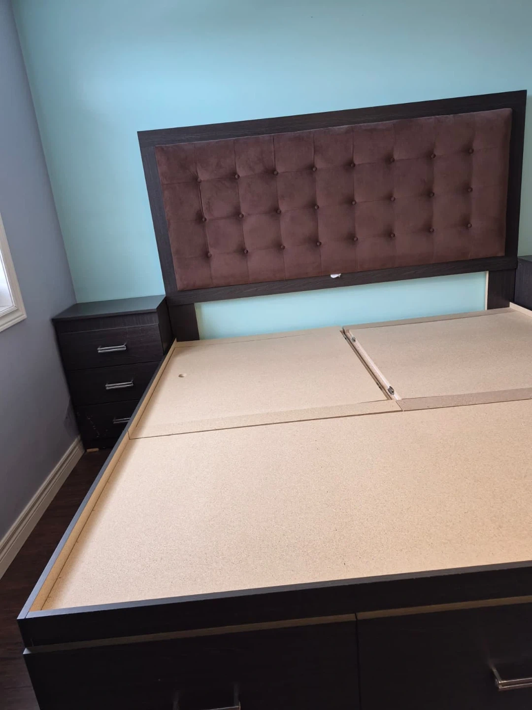 King-size storage bed with upholstered headboard and 2 matching nightstands.Built-in storage (great space saver). Clean and in good condition.Strong and sturdy frame.Selling as a set. Pickup only