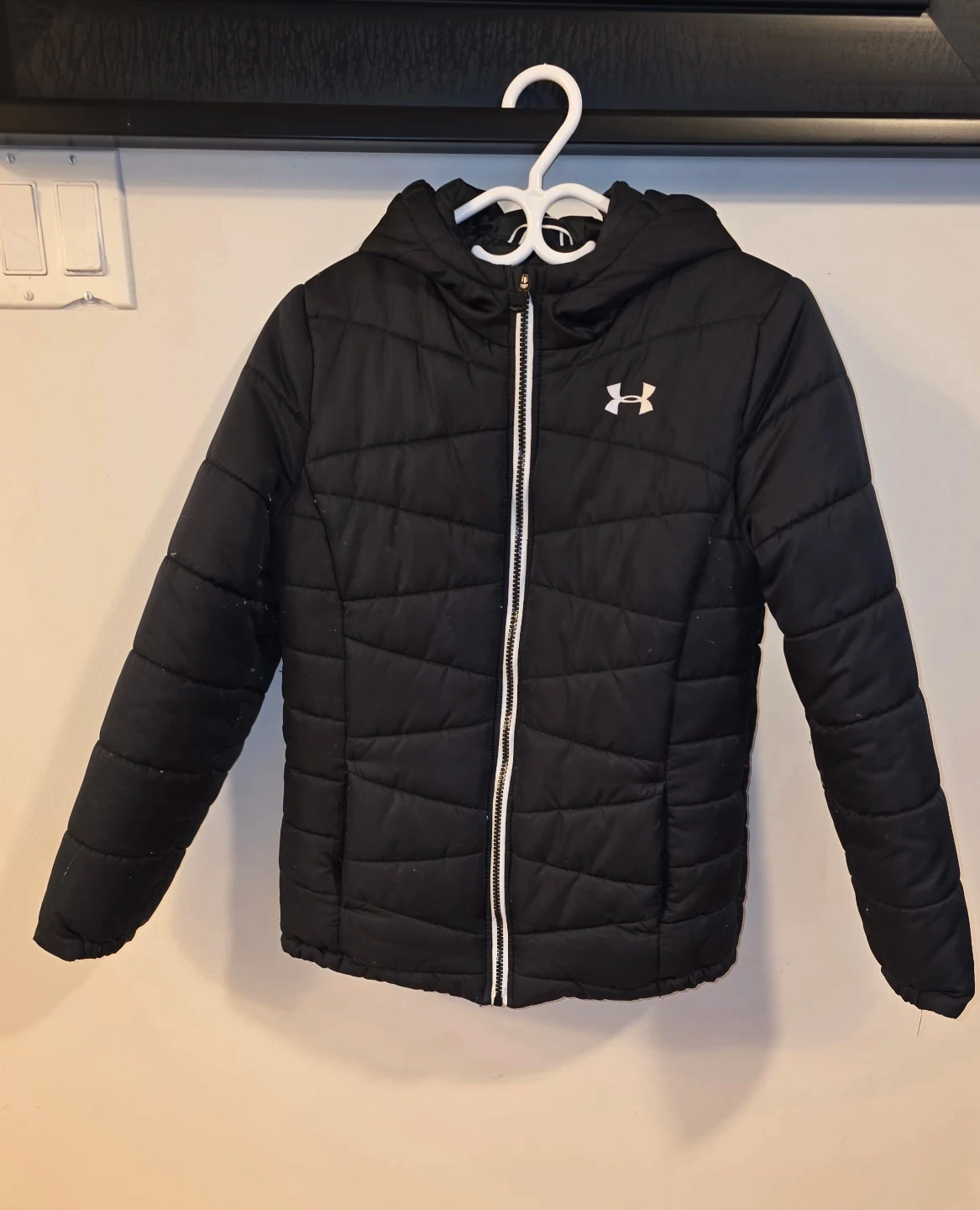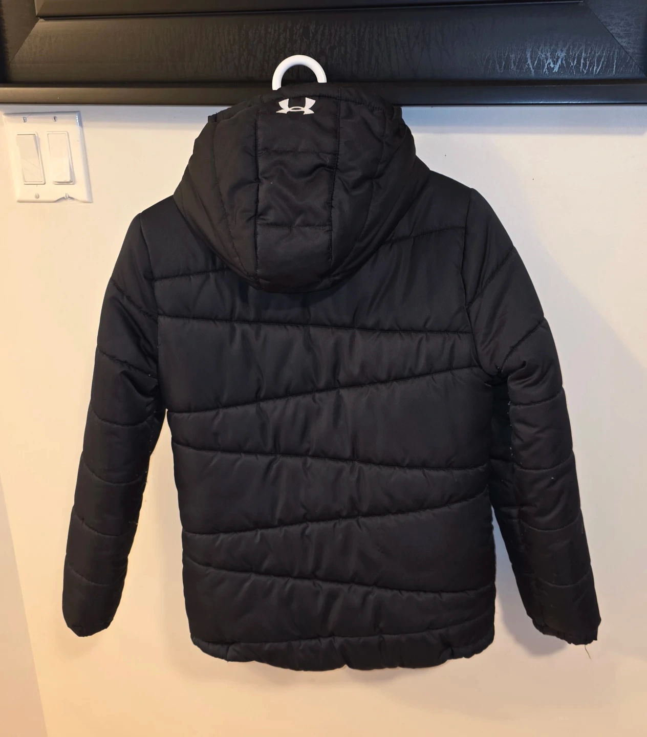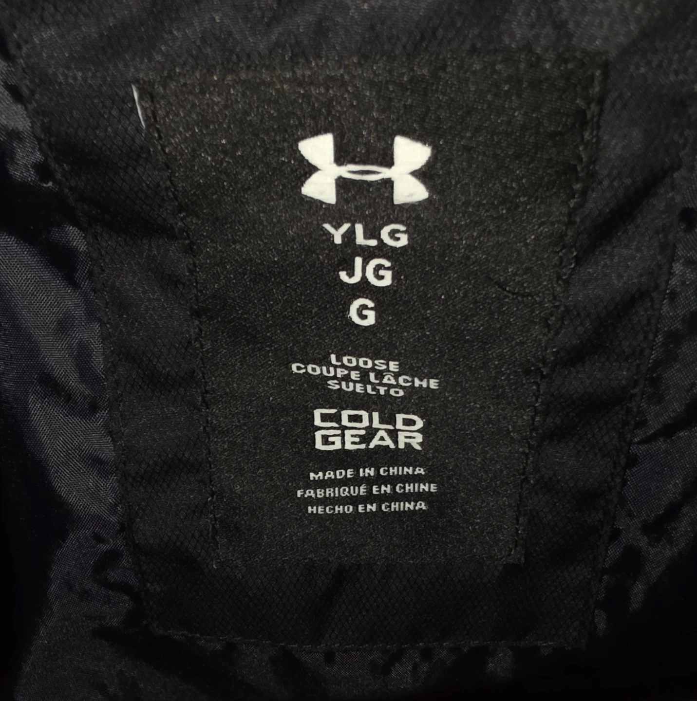 This is a black Under Armour puffer jacket for youth. It's made with ColdGear technology to help keep you warm. The fit is described as loose. It's a size YLG.