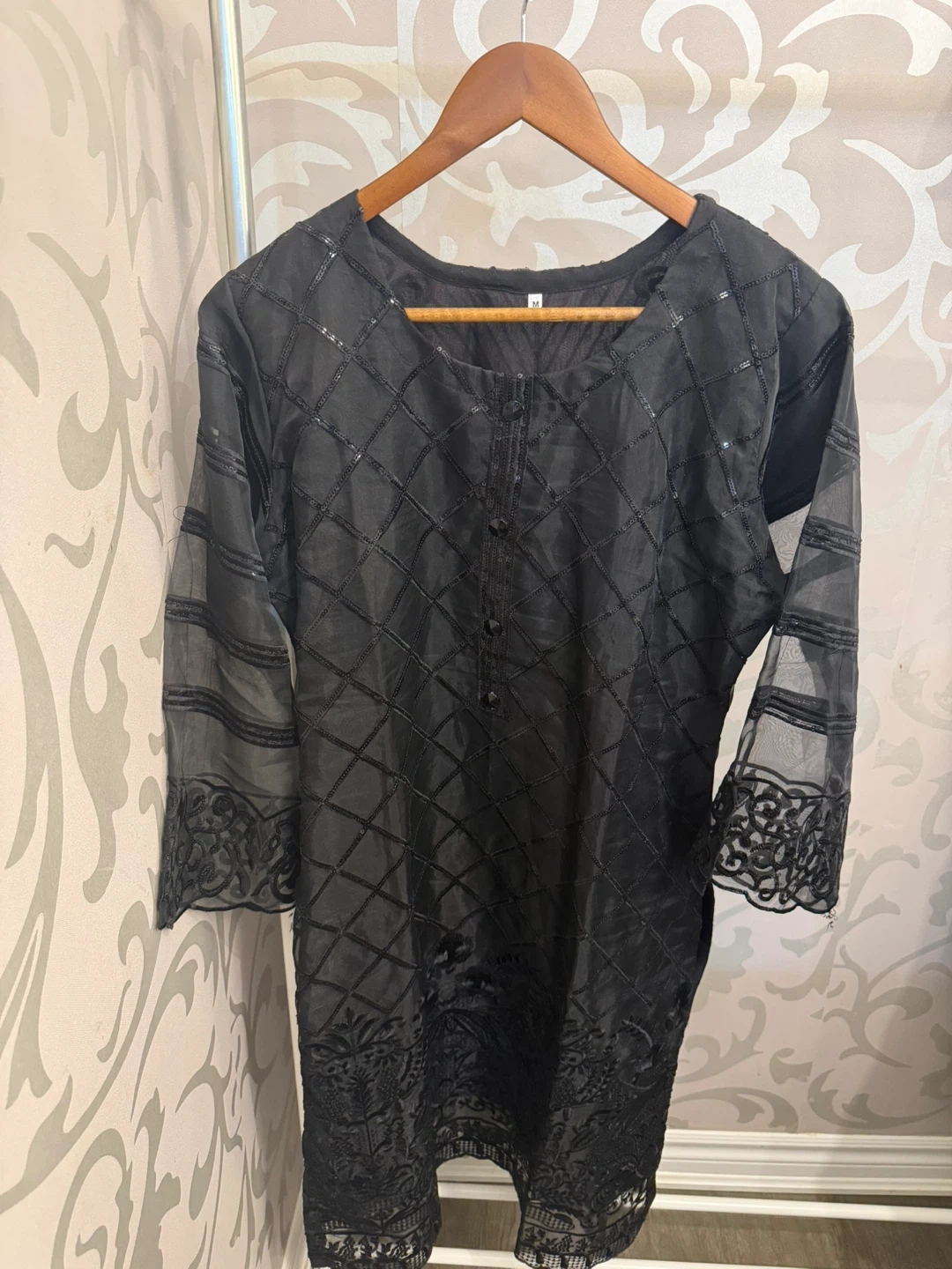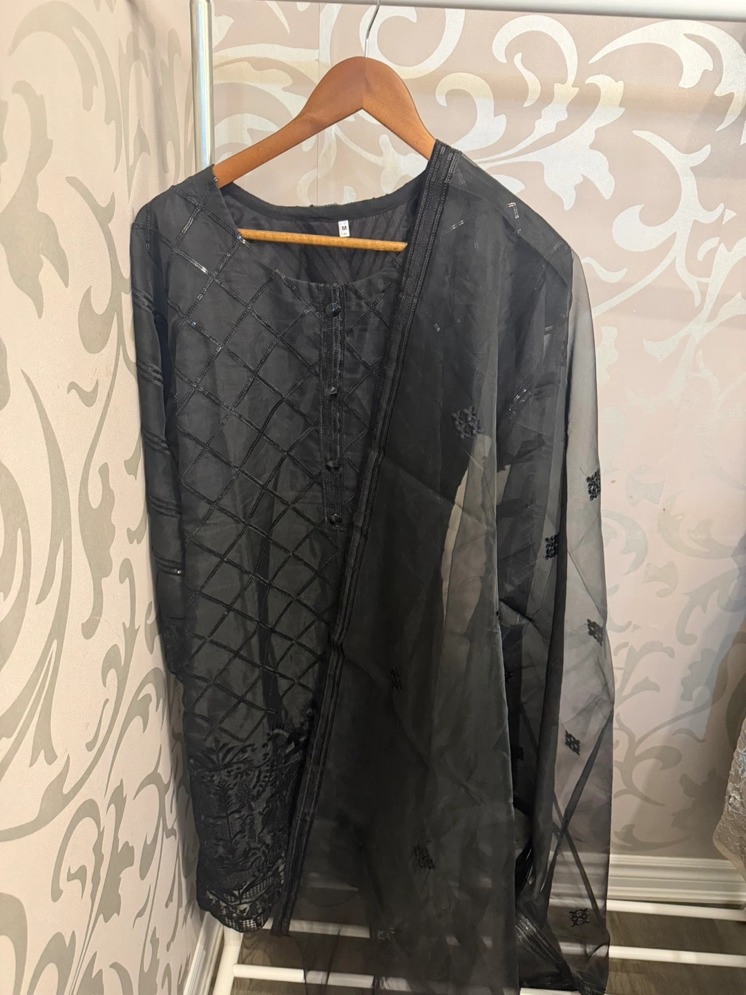 This is a black 3-piece outfit featuring an embroidered kurti with sequin details and lace accents. It includes matching trousers and a sheer dupatta with embroidered patterns. The kurti has a round neckline and button detailing. It's suitable for casual or semi-formal occasions. Size M.