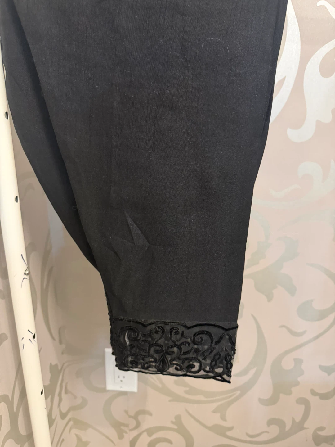 This is a black 3-piece outfit featuring an embroidered kurti with sequin details and lace accents. It includes matching trousers and a sheer dupatta with embroidered patterns. The kurti has a round neckline and button detailing. It's suitable for casual or semi-formal occasions. Size M.