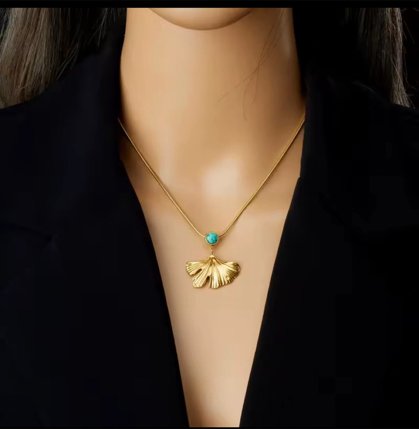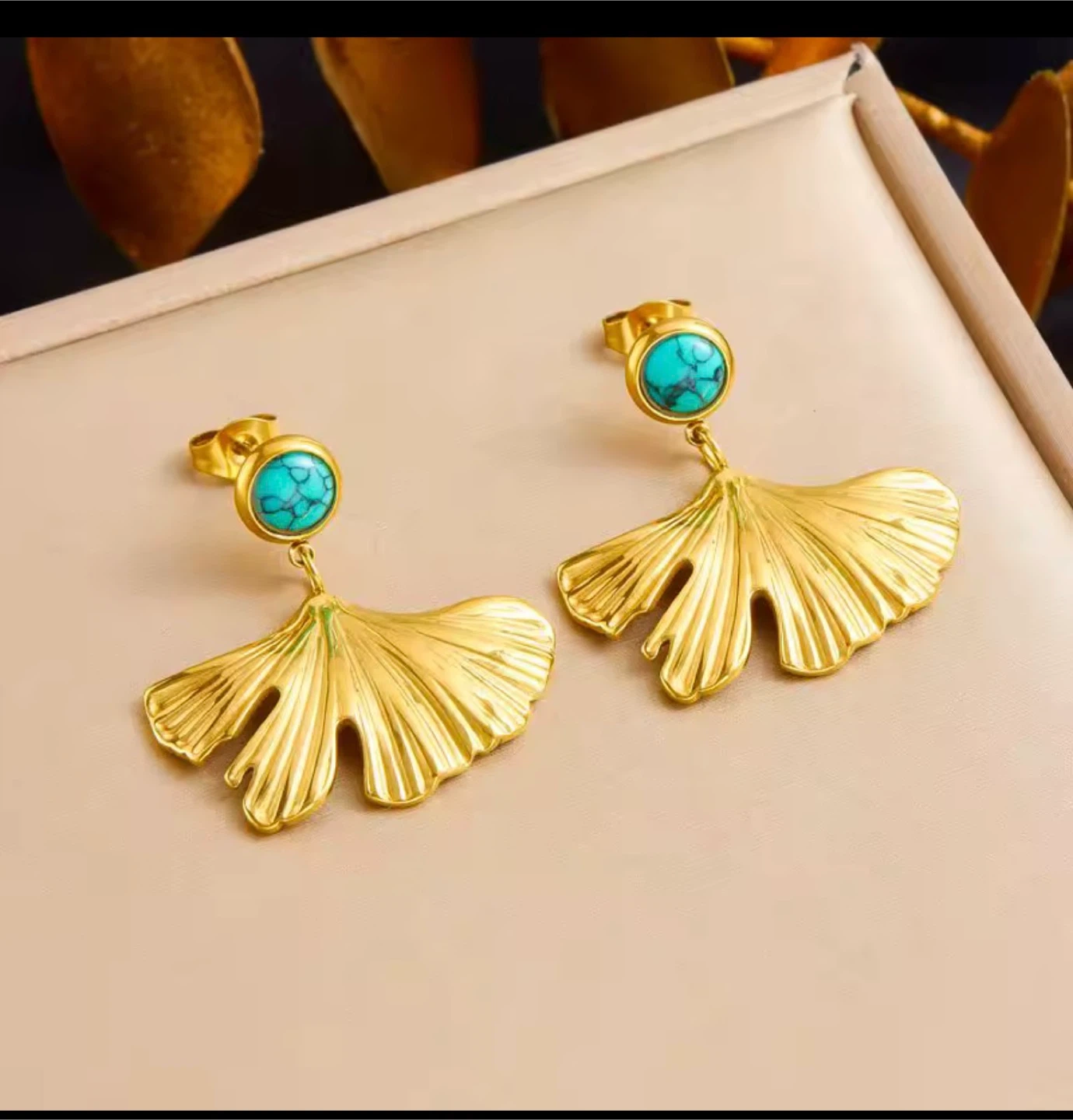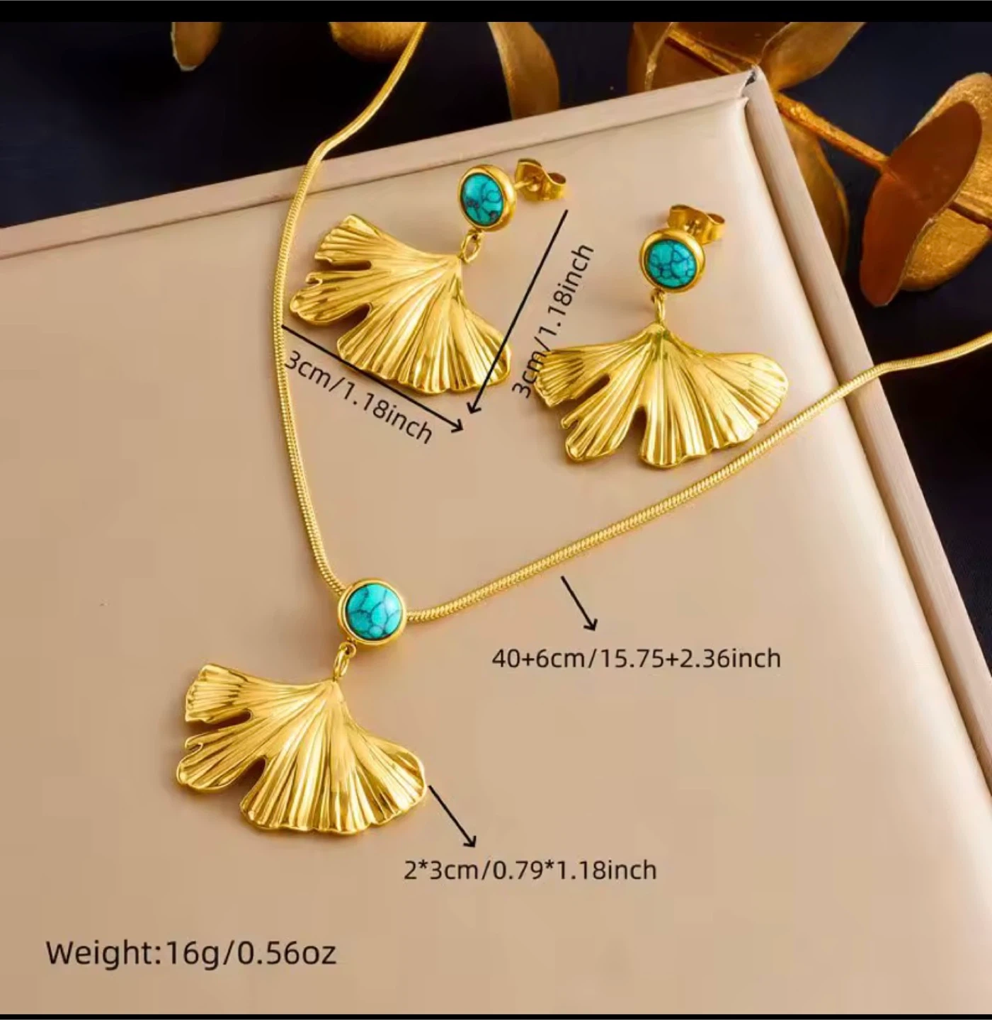 A stainless steel set plated with 18K gold, featuring a textured ginkgo‑leaf design with a turquoise stone for a vibrant, elegant look. Water‑resistant, durable, and perfect for daily wear or gifting. Pickup in Toronto – Kipling & Panorama, with Canada Post shipping available.