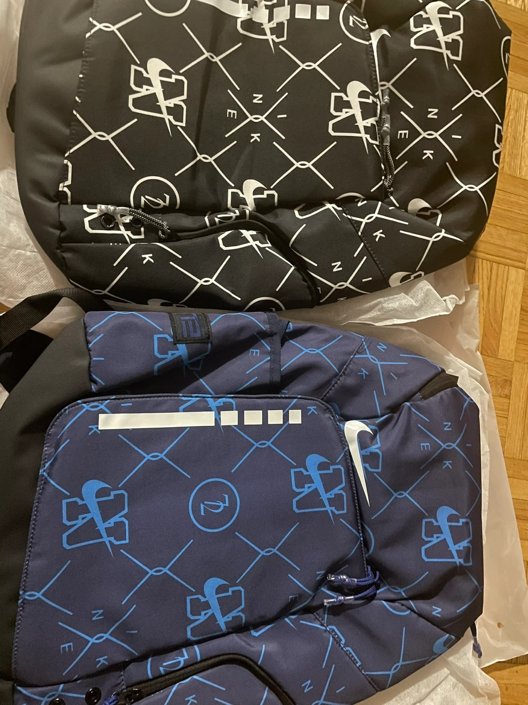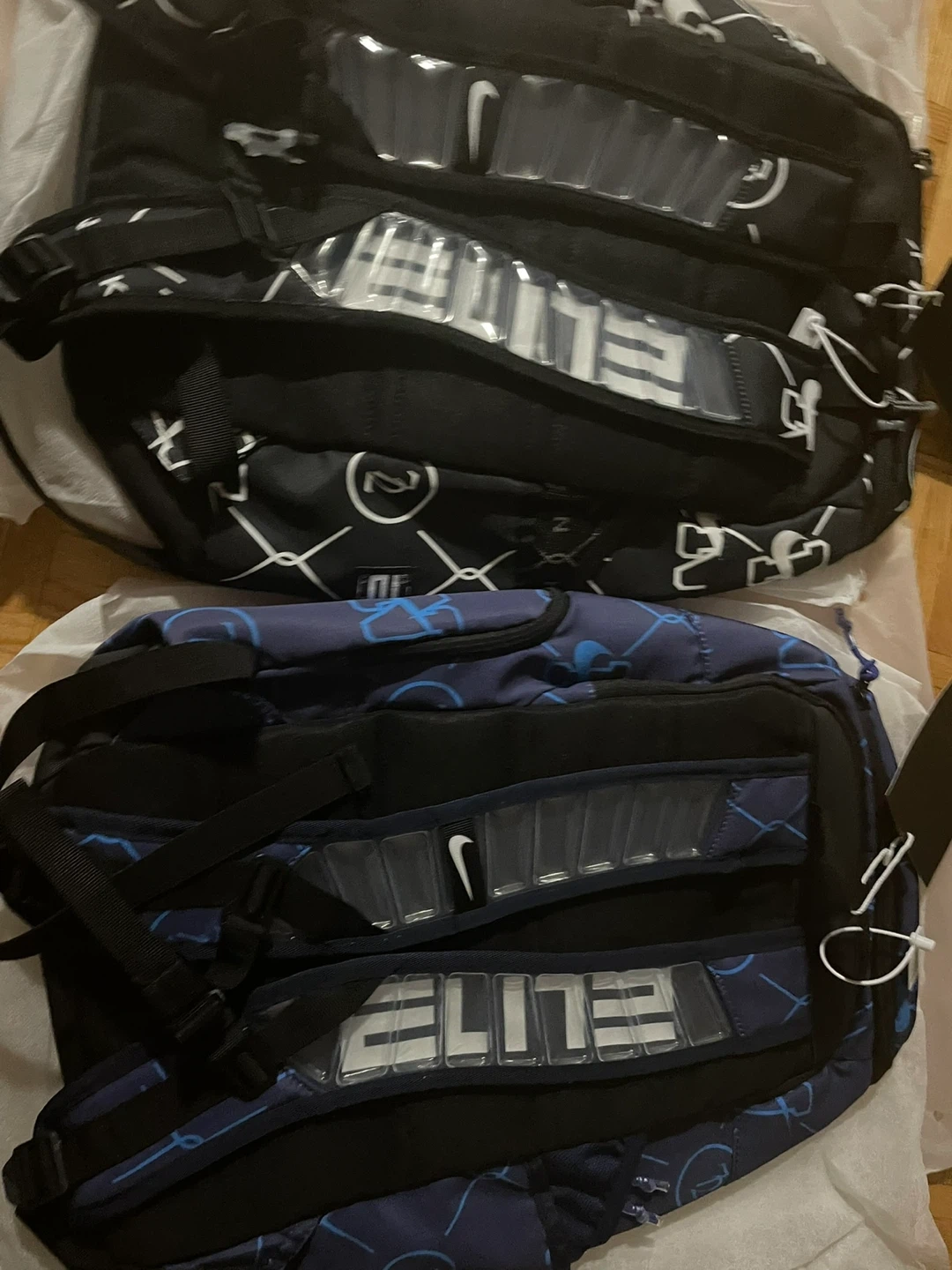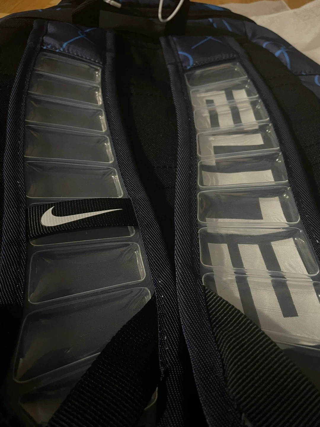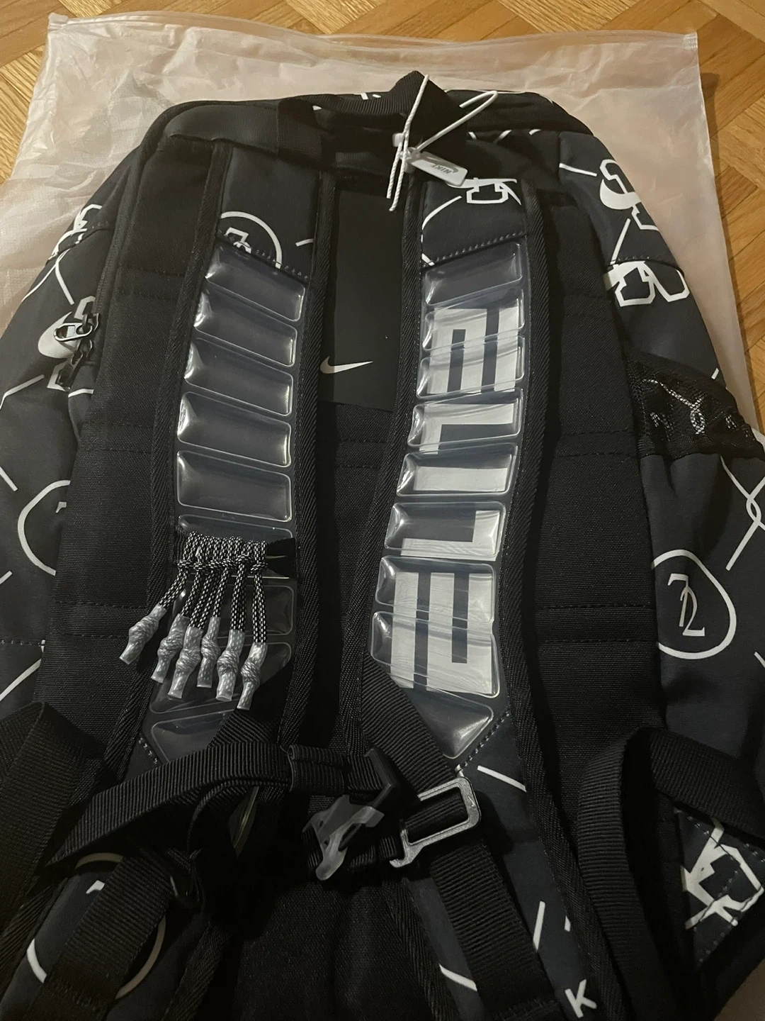 This is a Nike Elite backpack. It features the classic Nike logo and the "Elite" branding on the straps. The backpack has a patterned design. It's built for durability and style.