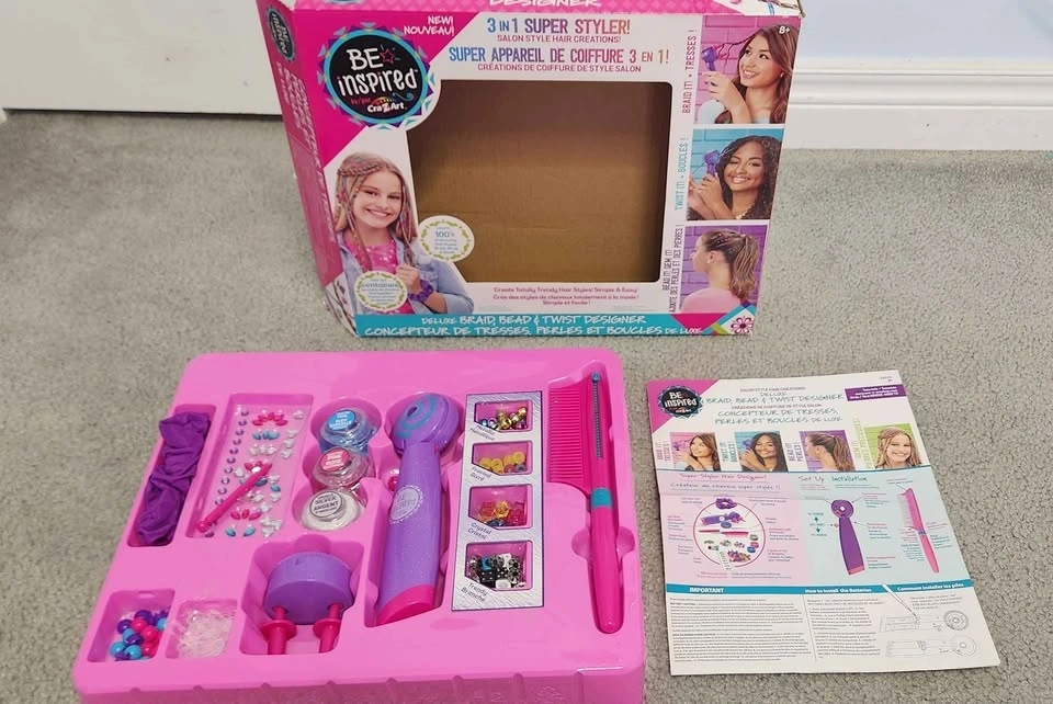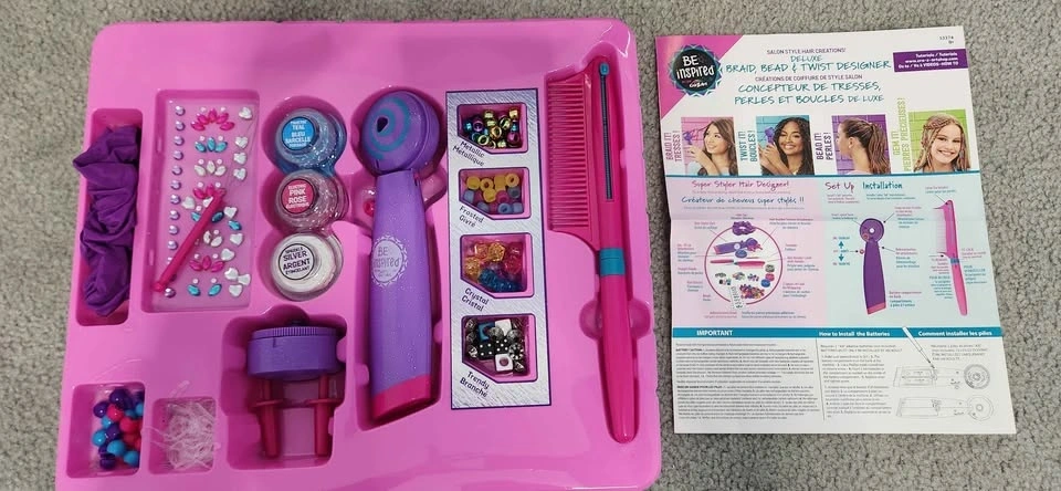 Opened but not used. Complete hair styling kit includes motorized hair braider unit, wrap attachment, beader comb, and threader. Set has three spools of colored cord, assorted metallic and frosted beads, hair gems, and elastic bands. Pickup Chinguacousy and Charolais in Brampton near Copeland Public School.