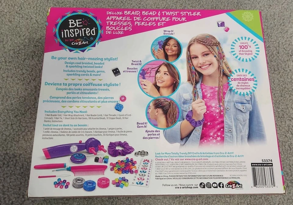 Opened but not used. Complete hair styling kit includes motorized hair braider unit, wrap attachment, beader comb, and threader. Set has three spools of colored cord, assorted metallic and frosted beads, hair gems, and elastic bands. Pickup Chinguacousy and Charolais in Brampton near Copeland Public School.