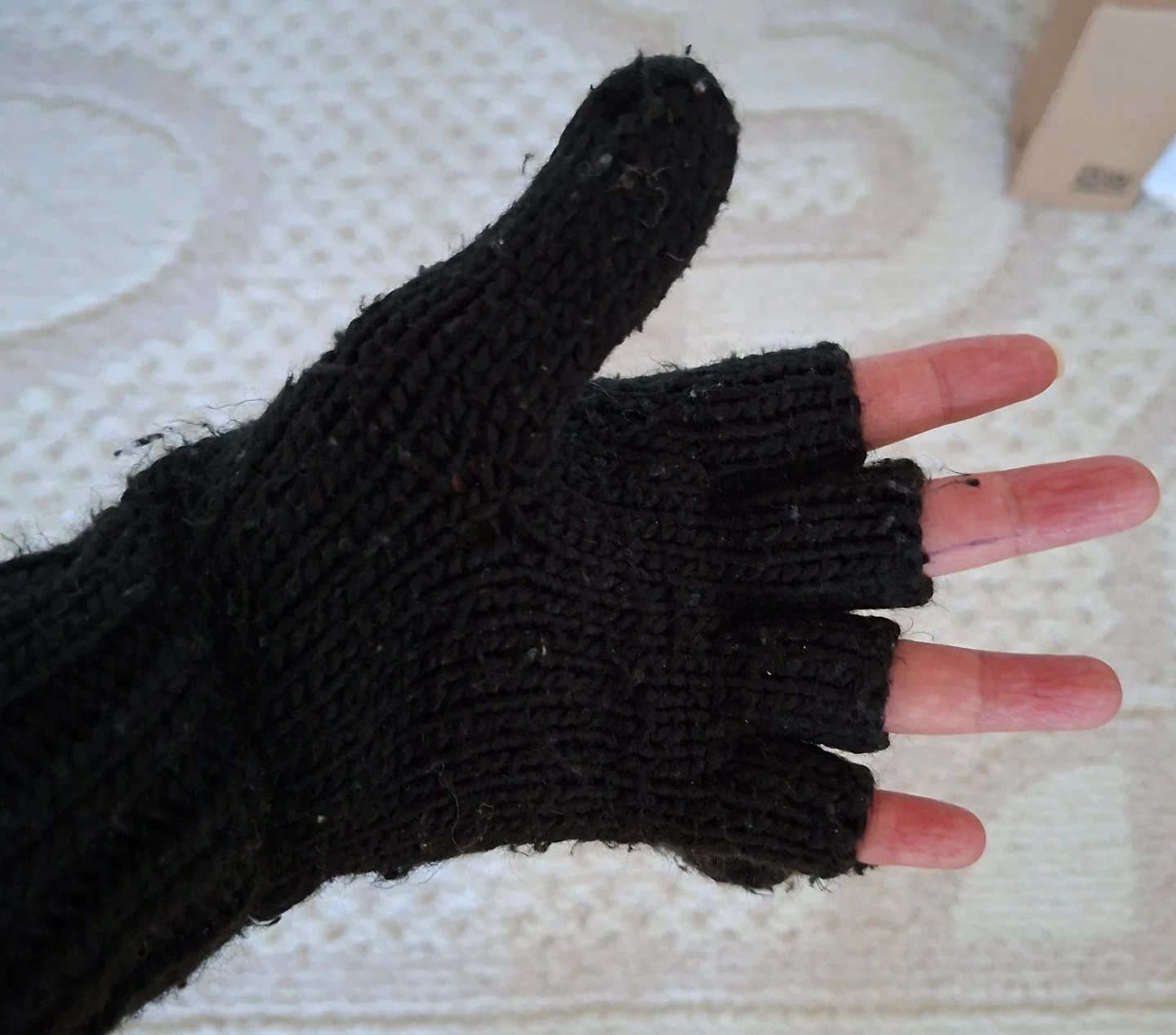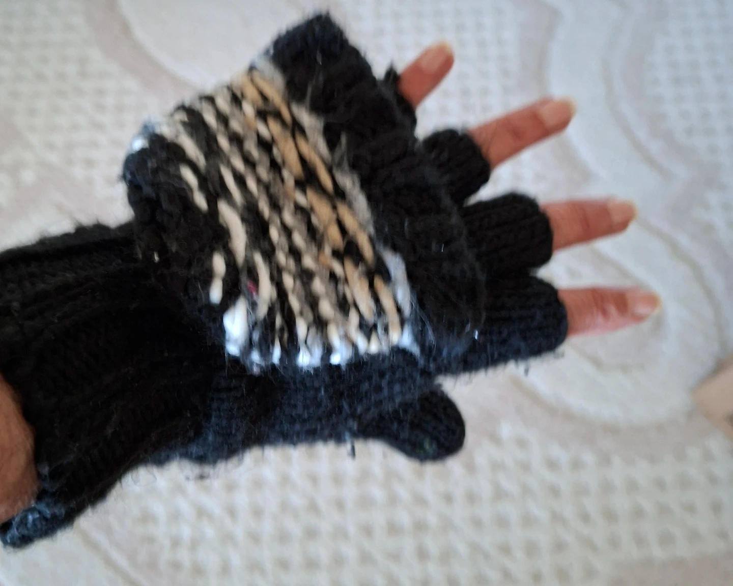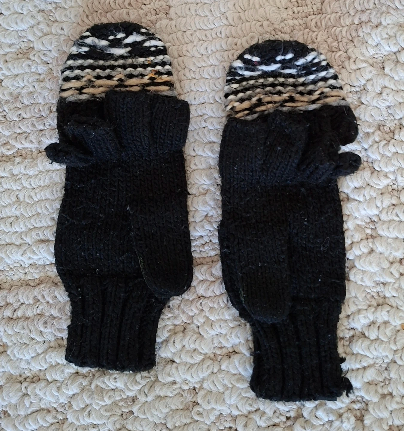 These Echo black knit convertible mittens from Echo. They have a mitten flap that can be secured with a button. The knit material is warm for chilly days. Fingerless glove option is available!